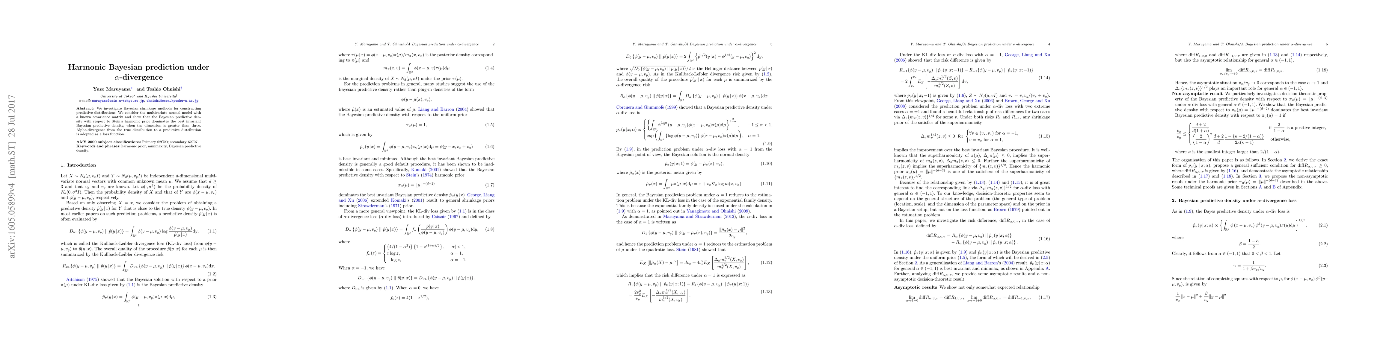 This paper explores Bayesian shrinkage methods for predictive distributions in a multivariate Normal model, demonstrating that the Bayesian predictive density using Stein's harmonic prior outperforms the best invariant Bayesian predictive density when the dimension exceeds three, using alpha-divergence as the loss function.