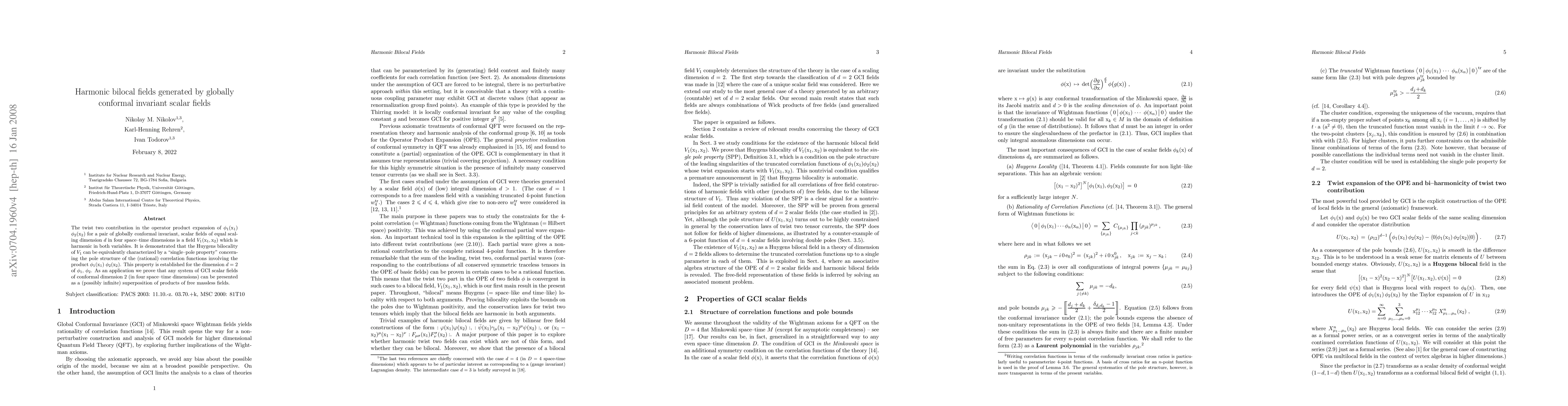 This paper explores the operator product expansion for globally conformal invariant scalar fields, demonstrating that the twist two contribution forms a harmonic bilocal field. It establishes a "single-pole property" for the correlation functions of these fields, proving that systems of such fields can be represented as superpositions of free massless fields.