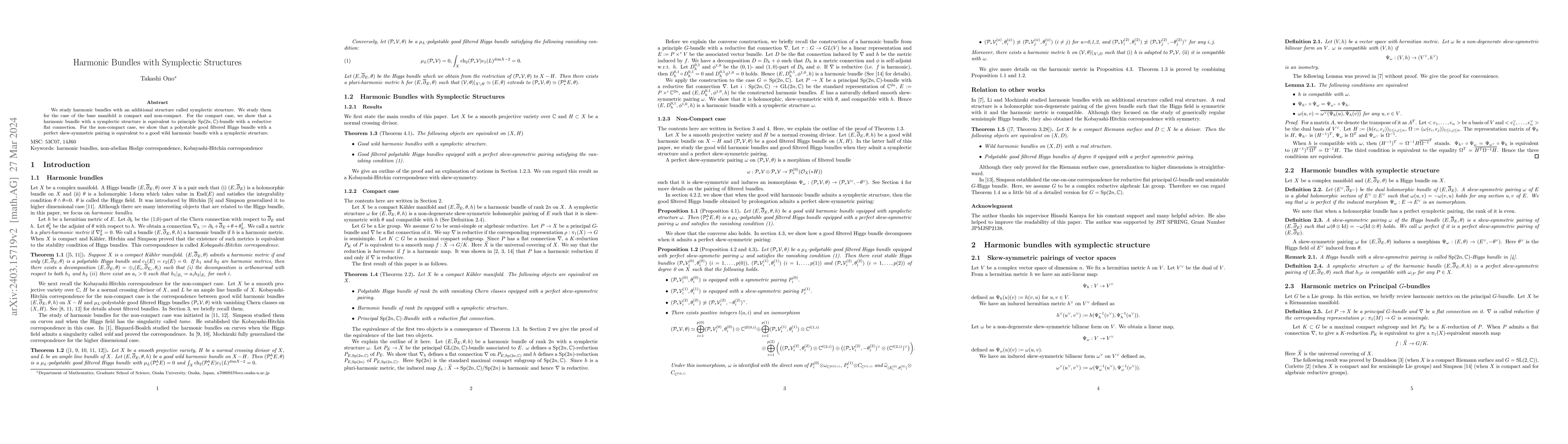 This paper investigates harmonic bundles equipped with symplectic structures, demonstrating equivalences in both compact and non-compact base manifold scenarios. For compact bases, it equates such harmonic bundles to $Sp(2n,\mathbb{C})$-bundles with reductive flat connections. In non-compact cases, it shows a correspondence between polystable good filtered Higgs bundles with skew-symmetric pairings and good wild harmonic bundles with symplectic structures.
