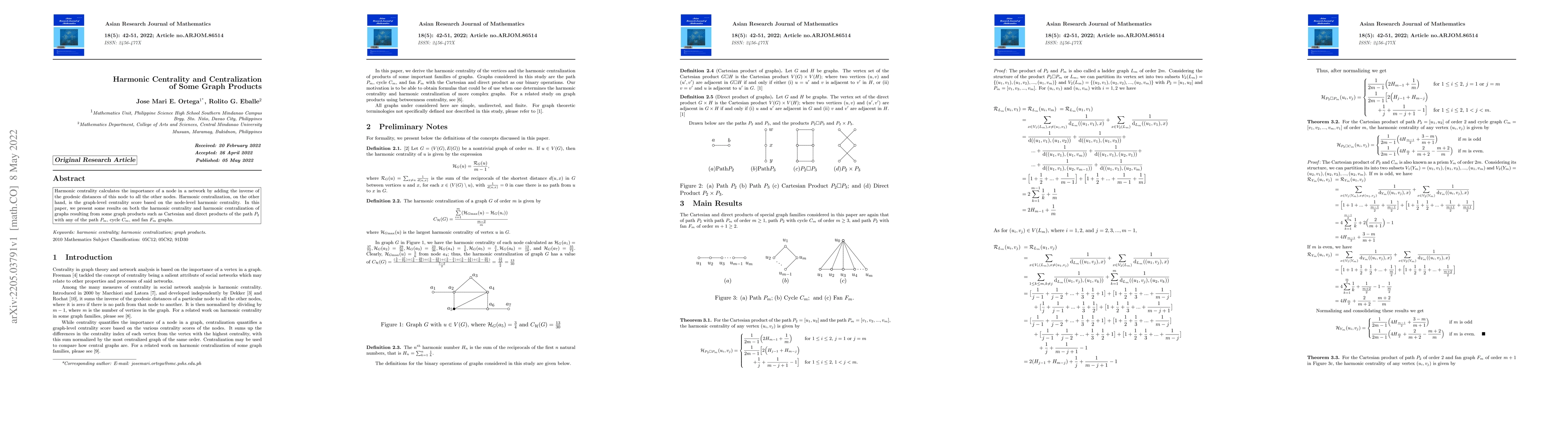 This paper explores harmonic centrality and centralization in graph products, specifically focusing on Cartesian and direct products involving $P_2$, $P_m$, $C_m$, and $F_m$ graphs. Key findings reveal specific formulas for these centrality measures in the resulting graphs.
