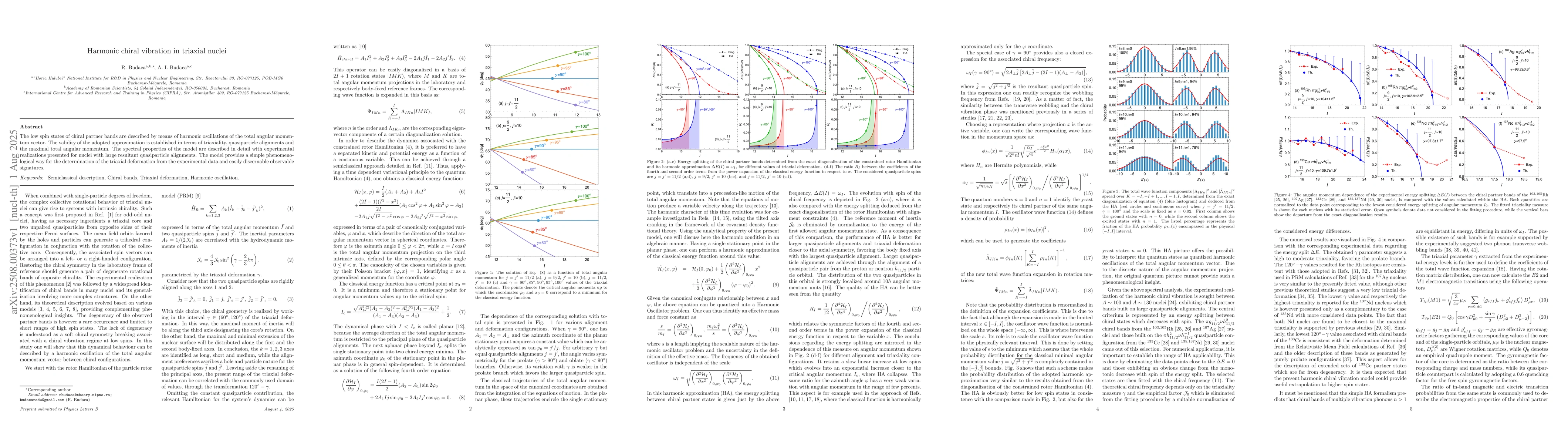 The low spin states of chiral partner bands are described by means of harmonic oscillations of the total angular momentum vector. The validity of the adopted approximation is established in terms of triaxiality, quasiparticle alignments and the maximal total angular momentum. The spectral properties of the model are described in detail with experimental realizations presented for nuclei with large resultant quasiparticle alignments. The model provides a simple phenomenological way for the determination of the triaxial deformation from the experimental data and easily discernable observable signatures.