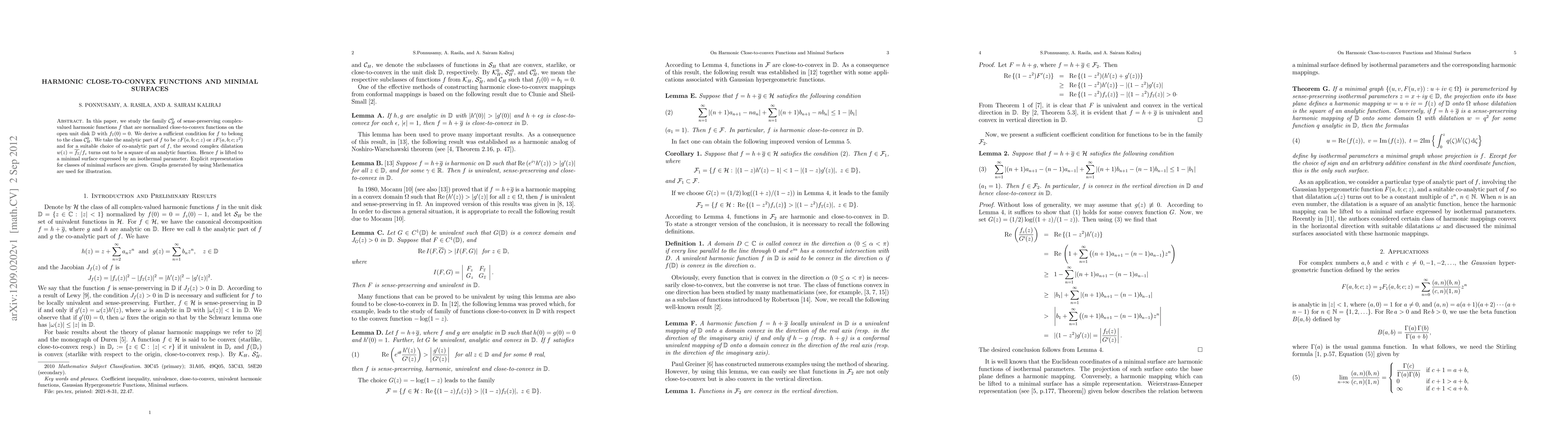 This paper studies sense-preserving complex-valued harmonic functions on the open unit disk, deriving a sufficient condition for them to belong to a specific class of functions, which can be lifted to minimal surfaces expressed by an isothermal parameter.