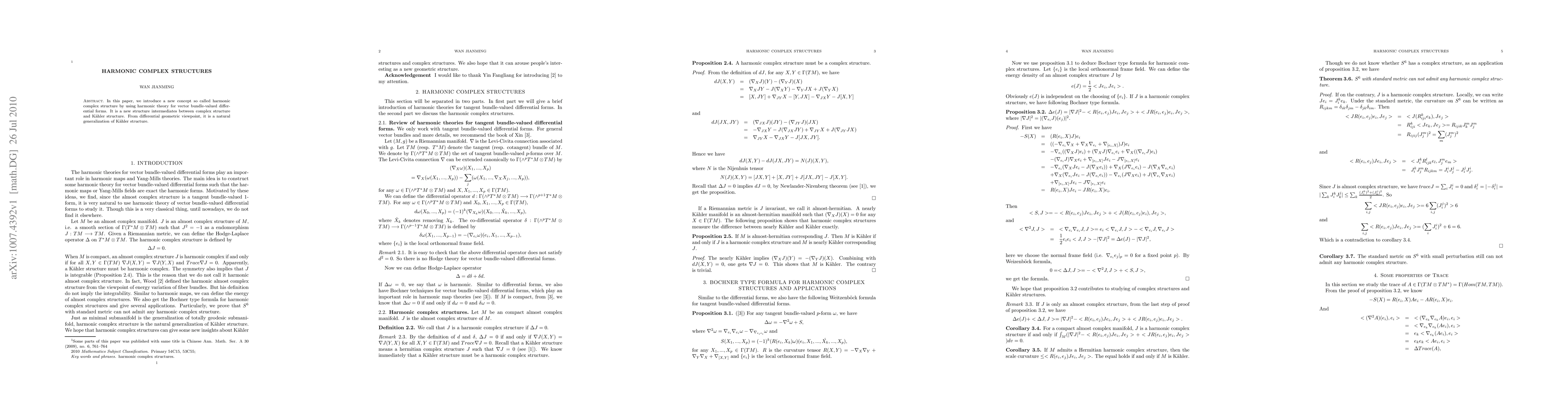 Summary: This paper proposes a novel harmonic complex structure, a new intermediate structure between complex and Kähler structures, utilizing harmonic theory for vector bundle-valued differential forms, and presents it as a natural generalization from a differential geometric perspective.