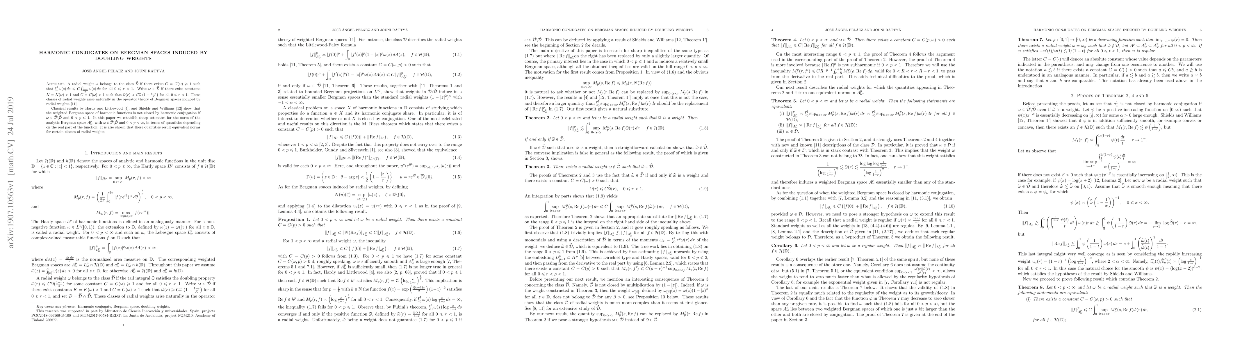 A radial weight $\omega$ belongs to the class $\widehat{\mathcal{D}}$ if there exists $C=C(\omega)\ge 1$ such that $\int_r^1 \omega(s)\,ds\le C\int_{\frac{1+r}{2}}^1\omega(s)\,ds$ for all $0\le r<1$. Write $\omega\in\check{\mathcal{D}}$ if there exist constants $K=K(\omega)>1$ and $C=C(\omega)>1$ such that $\widehat{\omega}(r)\ge C\widehat{\omega}\left(1-\frac{1-r}{K}\right)$ for all $0\le r<1$. In a recent paper, we have recently prove that these classes of radial weights arise naturally in the operator theory of Bergman spaces induced by radial weights. Classical results by Hardy and Littlewood, and Shields and Williams, show that the weighted Bergman space of harmonic functions is not closed by harmonic conjugation if $\omega\in\widehat{\mathcal{D}}\setminus \check{\mathcal{D}}$ and $0