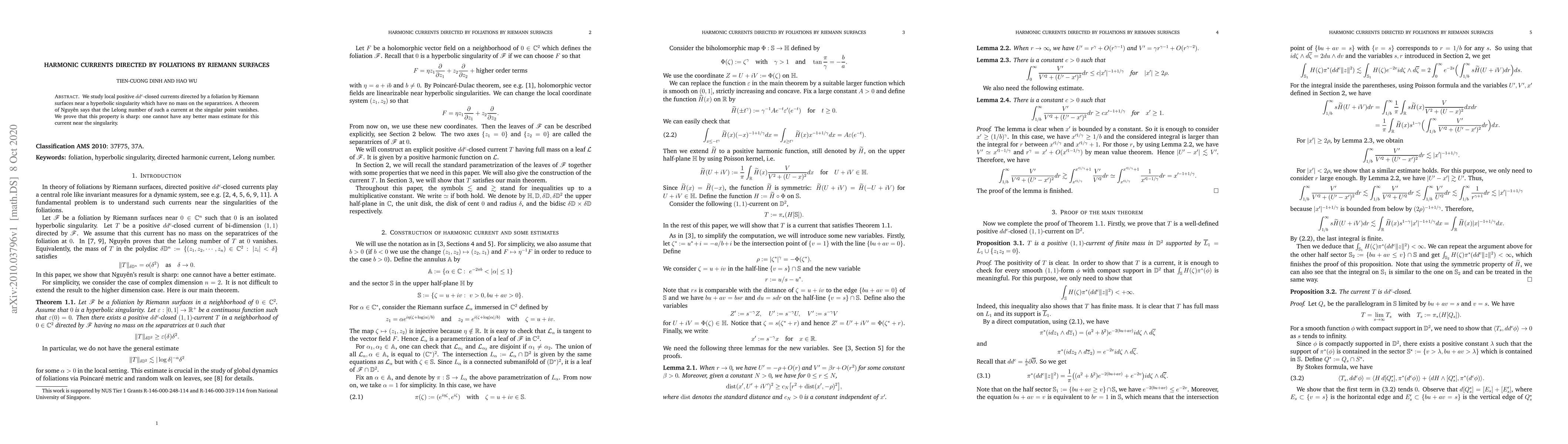 We study local positive harmonic currents directed by a foliation by Riemann surfaces near a hyperbolic singularity which have no mass on the separatrices. A theorem of Nguy\^en says that the Lelong number of such a current at the singular point vanishes. We prove that this property is sharp: one cannot have any better mass estimate for this current near the singularity.