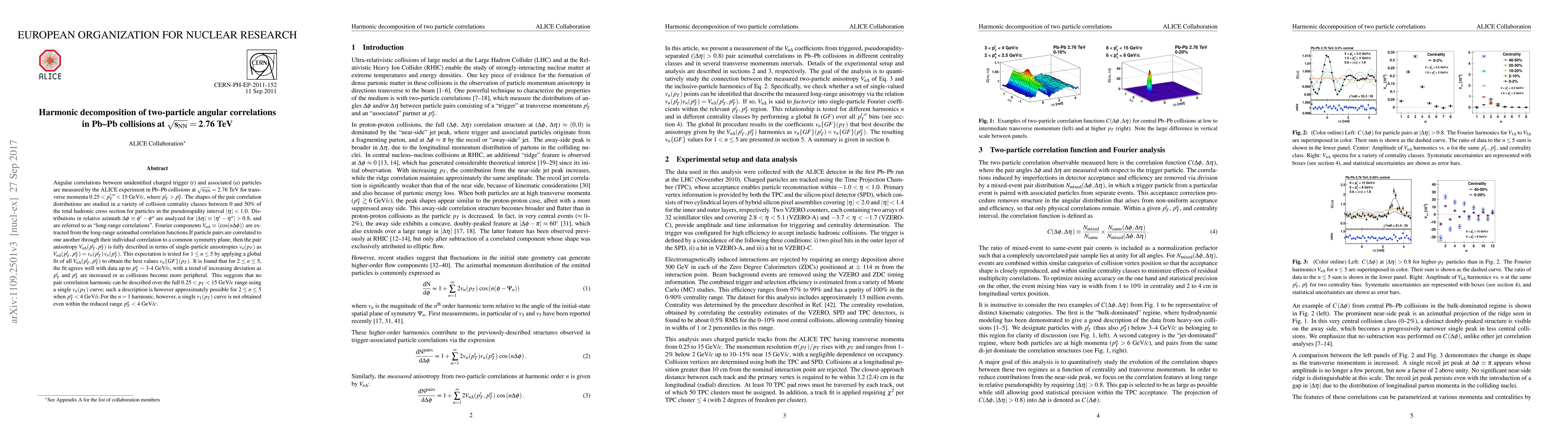 Angular correlations between unidentified charged trigger ($t$) and associated ($a$) particles are measured by the ALICE experiment in Pb-Pb collisions at $\sqrt{s_{\rm NN}}=2.76$ TeV for transverse momenta $0.25 < p_{T}^{t,\, a} < 15$ GeV/$c$, where $p_{T}^t > p_{T}^a$. The shapes of the pair correlation distributions are studied in a variety of collision centrality classes between 0 and 50% of the total hadronic cross section for particles in the pseudorapidity interval $|\eta| < 1.0$. Distributions in relative azimuth $\Delta\phi \equiv \phi^t - \phi^a$ are analyzed for $|\Delta\eta| \equiv |\eta^t - \eta^a| > 0.8$, and are referred to as "long-range correlations". Fourier components $V_{n\Delta} \equiv \langle \cos(n\Delta\phi)\rangle$ are extracted from the long-range azimuthal correlation functions. If particle pairs are correlated to one another through their individual correlation to a common symmetry plane, then the pair anisotropy $V_{n\Delta}(p_{T}^t, p_{T}^a)$ is fully described in terms of single-particle anisotropies $v_n (p_{T})$ as $V_{n\Delta}(p_{T}^t, p_{T}^a) = v_n(p_{T}^t) \, v_n(p_{T}^a)$. This expectation is tested for $1 \leq n \leq 5$ by applying a global fit of all $V_{n\Delta} (p_{T}^t, p_{T}^a)$ to obtain the best values $v_{n}\{GF\} (p_{T})$. It is found that for $2 \leq n \leq 5$, the fit agrees well with data up to $p_T^a \sim 3$-4 GeV/$c$, with a trend of increasing deviation as $p_{T}^t$ and $p_{T}^a$ are increased or as collisions become more peripheral. This suggests that no pair correlation harmonic can be described over the full $0.25 < p_{T} < 15$ GeV/$c$ range using a single $v_n(p_T)$ curve; such a description is however approximately possible for $2 \leq n \leq 5$ when $p_T^a < 4$ GeV/$c$. For the $n=1$ harmonic, however, a single $v_1(p_T$ curve is not obtained even within the reduced range $p_T^a < 4$ GeV/$c$.