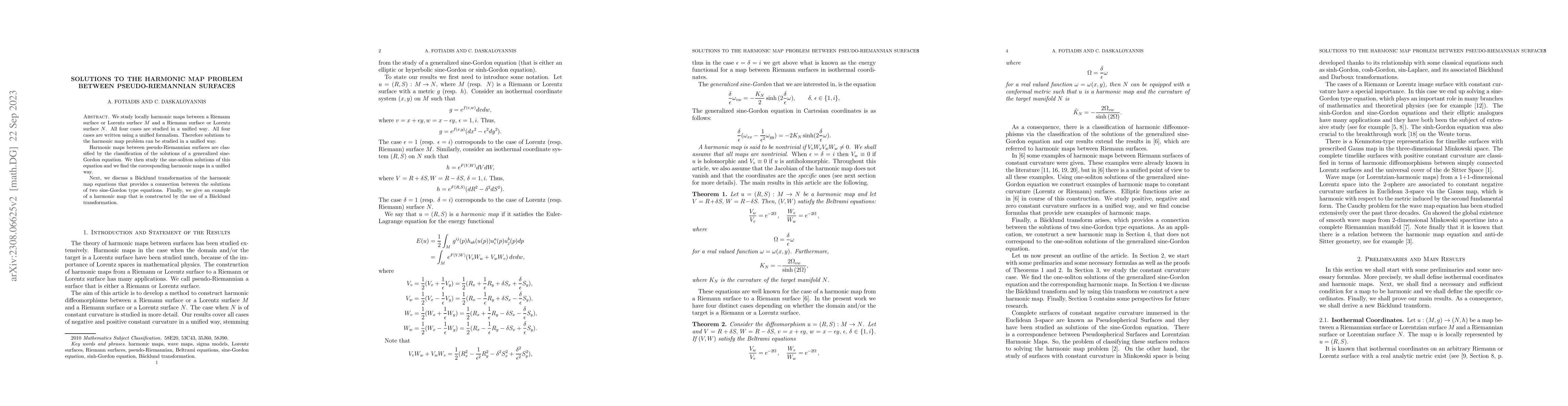 We study locally harmonic maps between a Riemann surface or Lorentz surface $M$ and a Riemann surface or Lorentz surface $N$. {All four cases are studied in a unified way}. All four cases are written using a unified formalism. Therefore solutions to the harmonic map problem can be studied in a unified way. Harmonic maps between pseudo-Riemannian surfaces are classified by the classification of the solutions of a generalized sine-Gordon equation. We then study the one-soliton solutions of this equation and we find the corresponding harmonic maps in a unified way. Next, we discuss a B\"acklund transformation of the harmonic map equations that provides a connection between the solutions of two sine-Gordon type equations. Finally, we give an example of a harmonic map that is constructed by the use of a B\"acklund transformation.