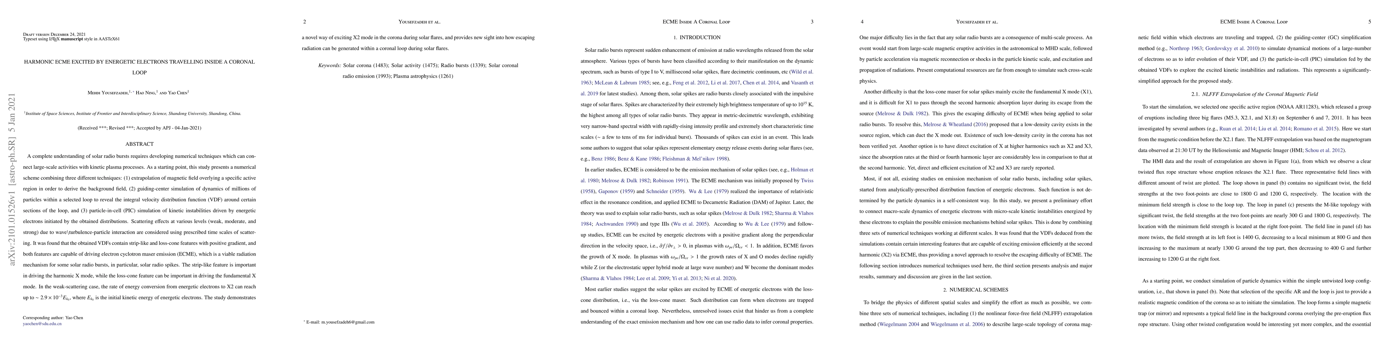 This study develops a numerical scheme combining magnetic field extrapolation, guiding-center particle simulations, and particle-in-cell simulations to explore the dynamics of energetic electrons in coronal loops. It reveals that strip-like and loss-cone velocity distributions can drive electron cyclotron maser emission, providing a mechanism for solar radio bursts, particularly spikes.