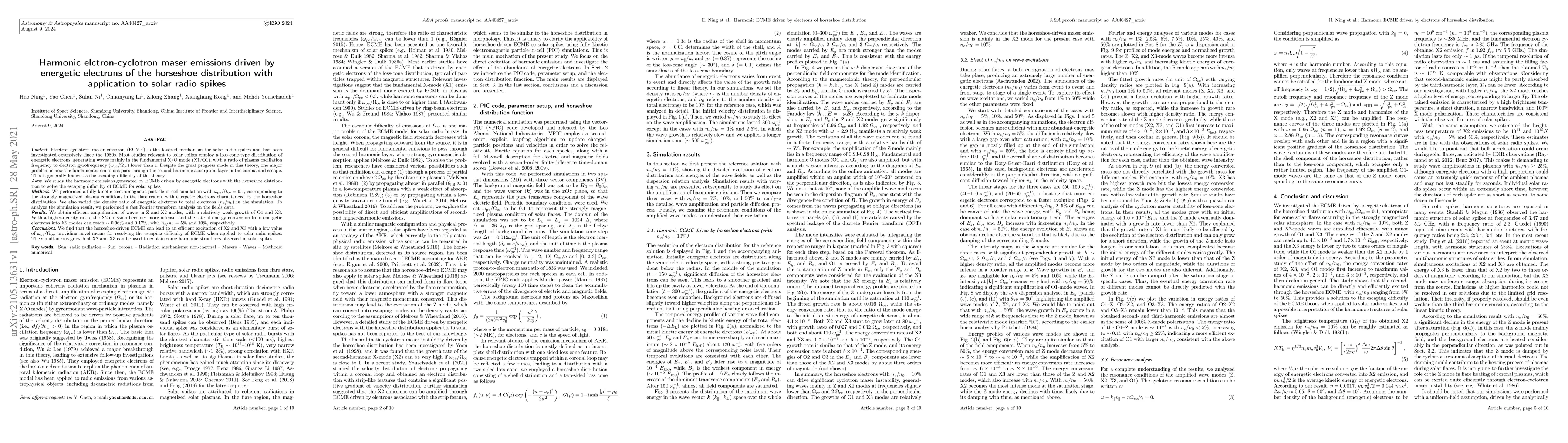 This paper investigates harmonic electron-cyclotron maser emission (ECME) driven by energetic electrons with a horseshoe distribution, aiming to resolve the escaping difficulty of fundamental ECME in solar radio spikes. Using kinetic PIC simulations, the study finds efficient amplification of X2 and X3 modes, suggesting a novel mechanism for explaining observed harmonic structures in solar spikes.