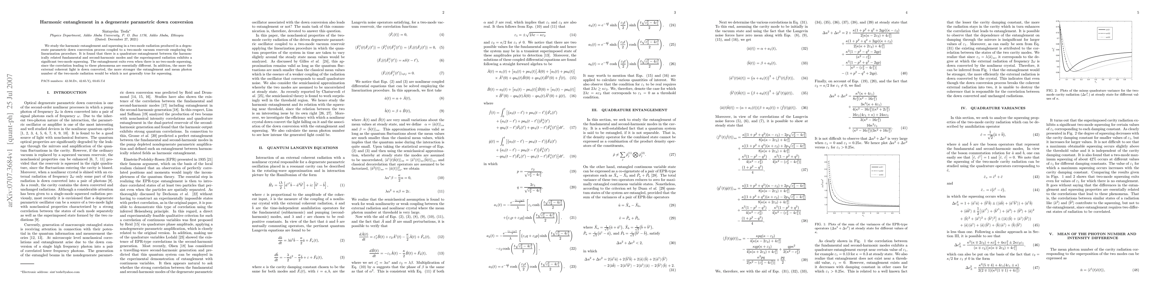 This paper investigates harmonic entanglement and squeezing in radiation from a degenerate parametric down conversion process. It finds quadrature entanglement between fundamental and second-harmonic modes, and significant two-mode squeezing, with entanglement persisting independently of squeezing. The study also reveals that stronger entanglement correlates with increased down-conversion of external coherent light.