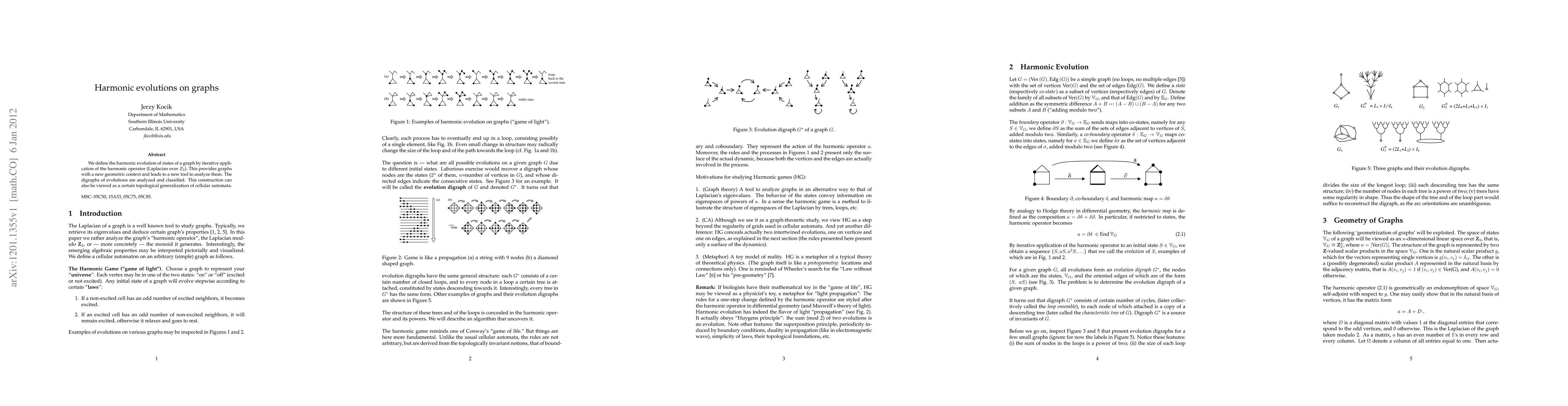 We define the harmonic evolution of states of a graph by iterative application of the harmonic operator (Laplacian over $Z_2$). This provides graphs with a new geometric context and leads to a new tool to analyze them. The digraphs of evolutions are analyzed and classified. This construction can also be viewed as a certain topological generalization of cellular automata.