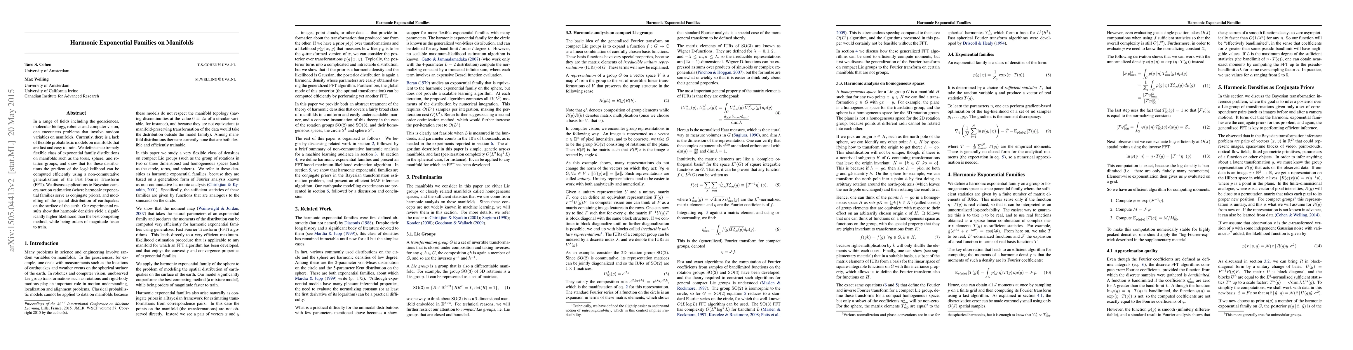 This paper introduces a new class of harmonic exponential family distributions on manifolds, enabling efficient computation of log-likelihood gradients using a non-commutative FFT. It demonstrates applications in Bayesian camera motion estimation and earthquake distribution modeling, showing superior performance in terms of likelihood and training speed.