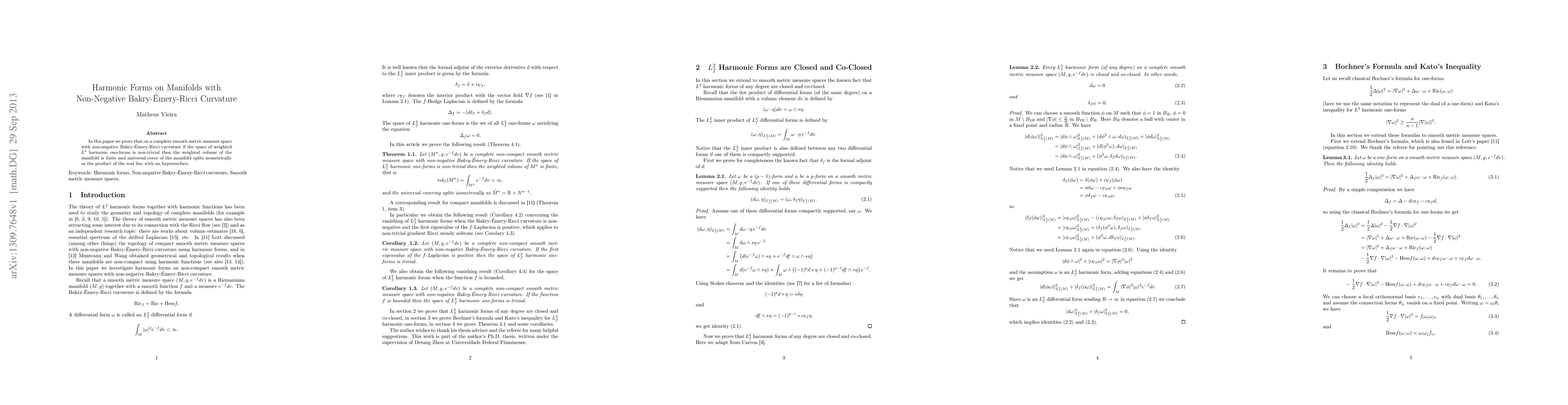 In this paper we prove that on a complete smooth metric measure space with non-negative Bakry-\'Emery-Ricci curvature if the space of weighted L^2 harmonic one-forms is non-trivial then the weighted volume of the manifold is finite and universal cover of the manifold splits isometrically as the product of the real line with an hypersurface.