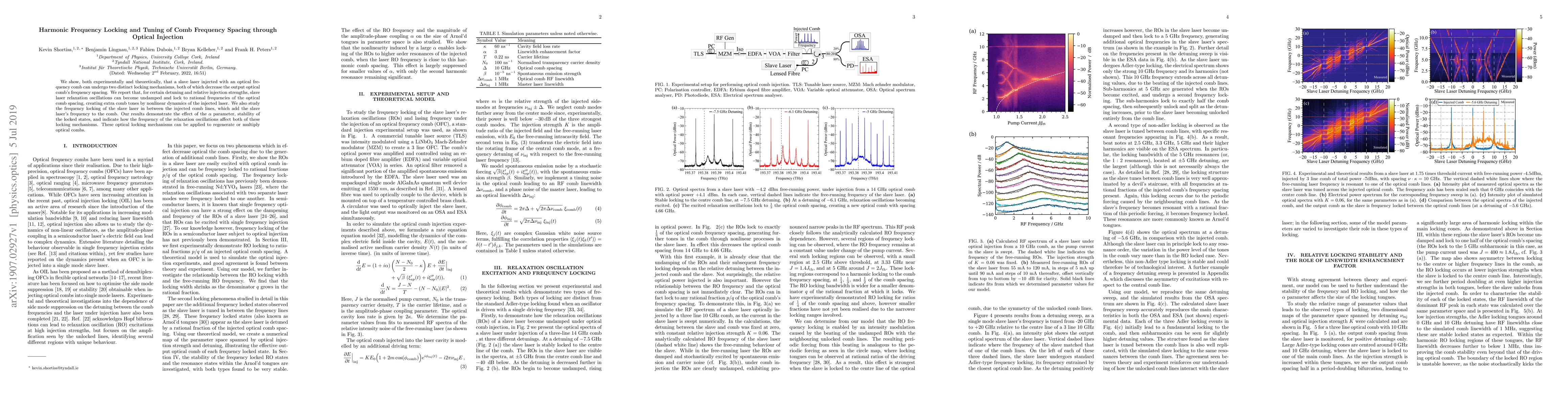 This paper demonstrates experimentally and theoretically two locking mechanisms in a slave laser injected with an optical frequency comb, both reducing comb frequency spacing. It shows how relaxation oscillations can lock to rational frequencies of the comb, generating extra tones, and how the slave laser can also lock between comb lines, adding its frequency. The study examines the influence of the alpha parameter, stability of the locked states, and the effect of relaxation oscillation frequency on these mechanisms.