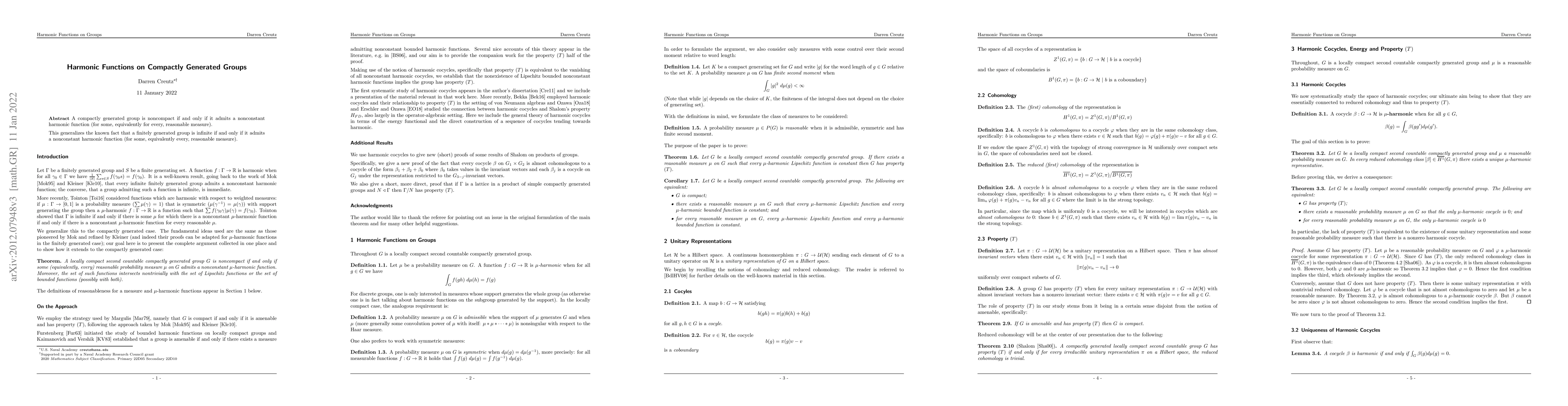 This paper establishes that a compactly generated group is noncompact if and only if it admits a nonconstant harmonic function under a reasonable measure, extending the known result for finitely generated groups.