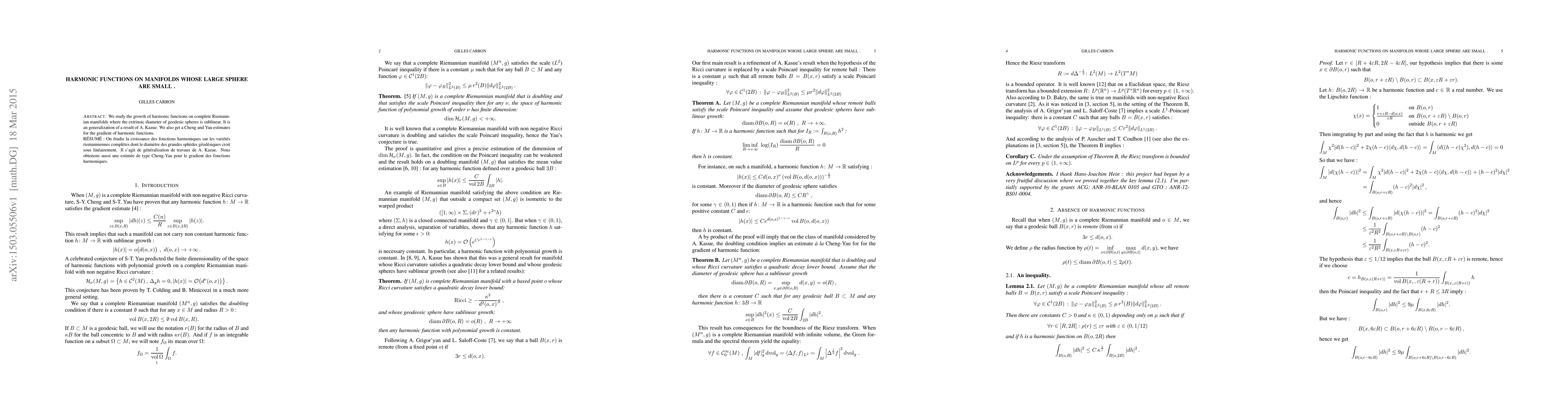 We study the growth of harmonic functions on complete Riemann-ian manifolds where the extrinsic diameter of geodesic spheres is sublinear. It is an generalization of a result of A. Kazue. We also get a Cheng and Yau estimates for the gradient of harmonic functions.
