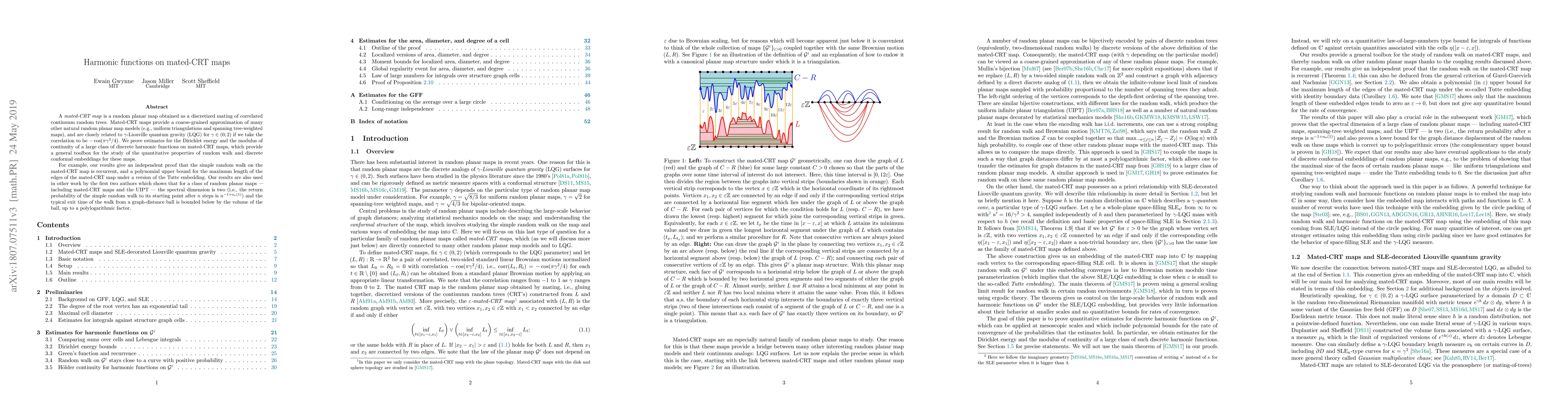 This paper studies harmonic functions on mated-CRT maps, proving estimates for their Dirichlet energy and modulus of continuity. These results confirm the recurrence of simple random walk on mated-CRT maps and provide bounds for the map's edge lengths, contributing to the understanding of random planar maps' spectral dimension and embeddings.