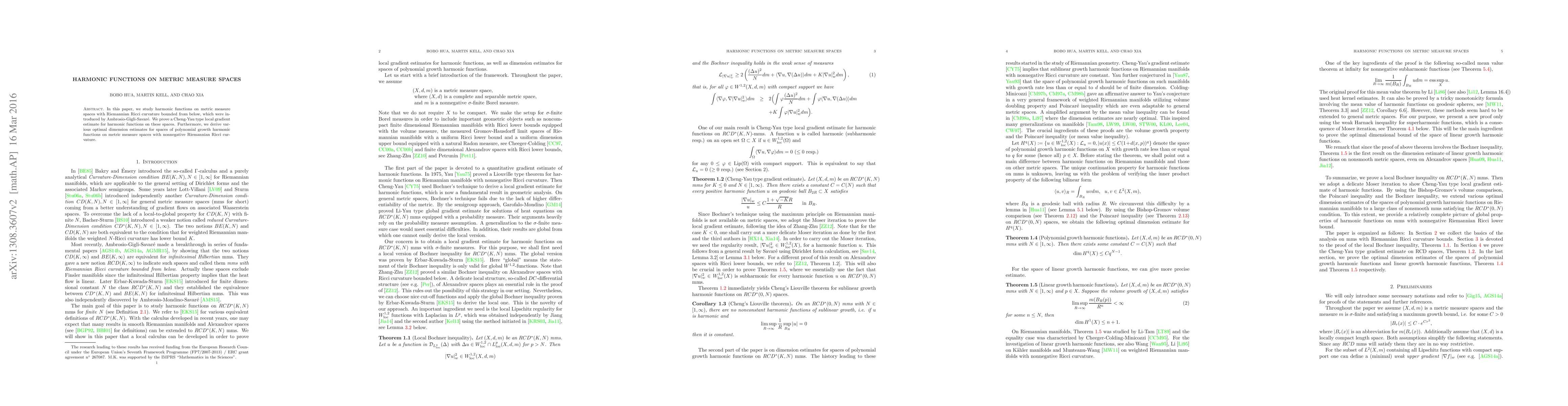 This paper investigates harmonic functions on metric measure spaces with Ricci curvature bounds, proving a local gradient estimate akin to Cheng-Yau's and deriving optimal dimension estimates for polynomial growth harmonic functions with nonnegative Ricci curvature.