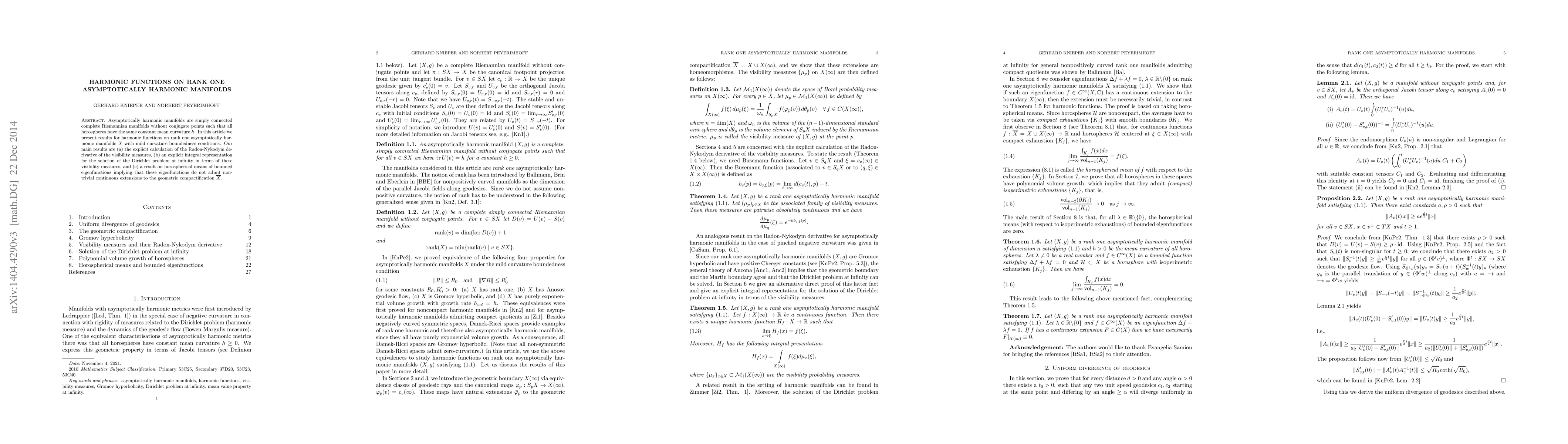 This paper investigates harmonic functions on rank one asymptotically harmonic manifolds, deriving explicit expressions for the Radon-Nykodym derivative of visibility measures, integral representations for Dirichlet problem solutions at infinity, and demonstrating that bounded eigenfunctions lack continuous extensions to the geometric compactification.