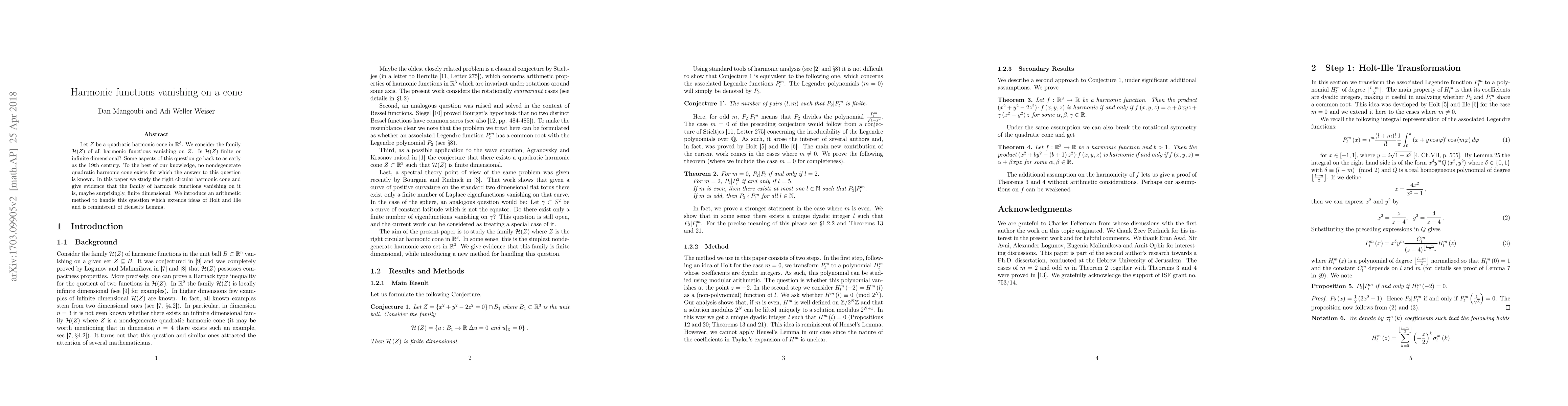This paper investigates the dimensionality of harmonic functions vanishing on a right circular harmonic cone in $\mathbb{R}^{3}$. It proposes an arithmetic method suggesting that these functions form a finite-dimensional family, extending previous ideas and providing new insights into a century-old question.