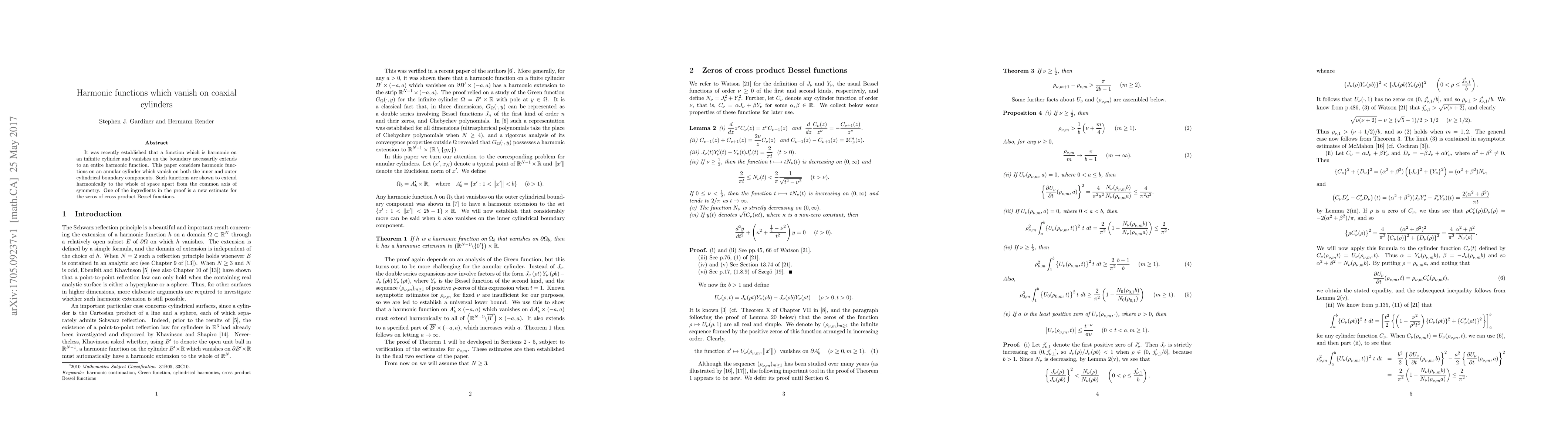 This paper extends the concept of harmonic functions vanishing on cylindrical boundaries to annular cylinders, proving they extend harmonically to all space except the symmetry axis, with a new estimate for Bessel function zeros aiding the proof.