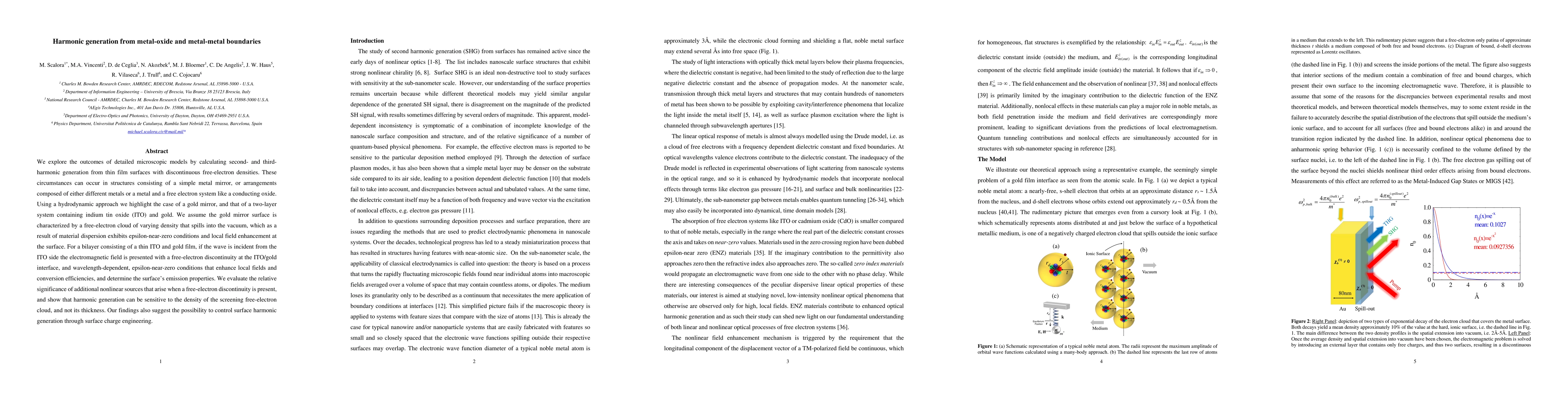 We explore the outcomes of detailed microscopic models by calculating second- and third-harmonic generation from thin film surfaces with discontinuous free-electron densities. These circumstances can occur in structures consisting of a simple metal mirror, or arrangements composed of either different metals or a metal and a free electron system like a conducting oxide. Using a hydrodynamic approach we highlight the case of a gold mirror, and that of a two-layer system containing indium tin oxide (ITO) and gold. We assume the gold mirror surface is characterized by a free-electron cloud of varying density that spills into the vacuum, which as a result of material dispersion exhibits epsilon-near-zero conditions and local field enhancement at the surface. For a bylayer consisting of a thin ITO and gold films, if the wave is incident from the ITO side the electromagnetic field is presented with a free-electron discontinuity at the ITO/gold interface, and wavelength-dependent, epsilon-near-zero conditions that enhance local fields and conversion efficiencies, and determine the surface's emission properties. We evaluate the relative significance of additional nonlinear sources that arise when a free-electron discontinuity is present, and show that harmonic generation can be sensitive to the density of the screening free-electron cloud, and not its thickness. Our findings also suggest the possibility to control surface harmonic generation through surface charge engineering.