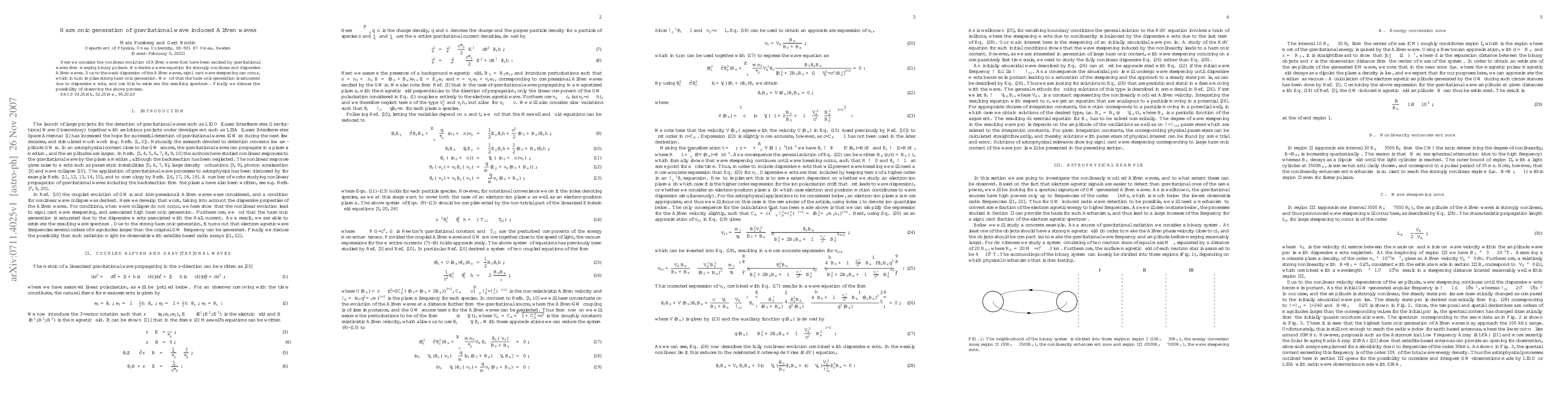 This paper investigates the nonlinear evolution of Alfven waves excited by gravitational waves from merging binary pulsars, deriving a wave equation for these waves. The study finds that harmonic generation is saturated by dispersive effects, providing an estimate of the resulting spectrum and discussing potential observational implications.