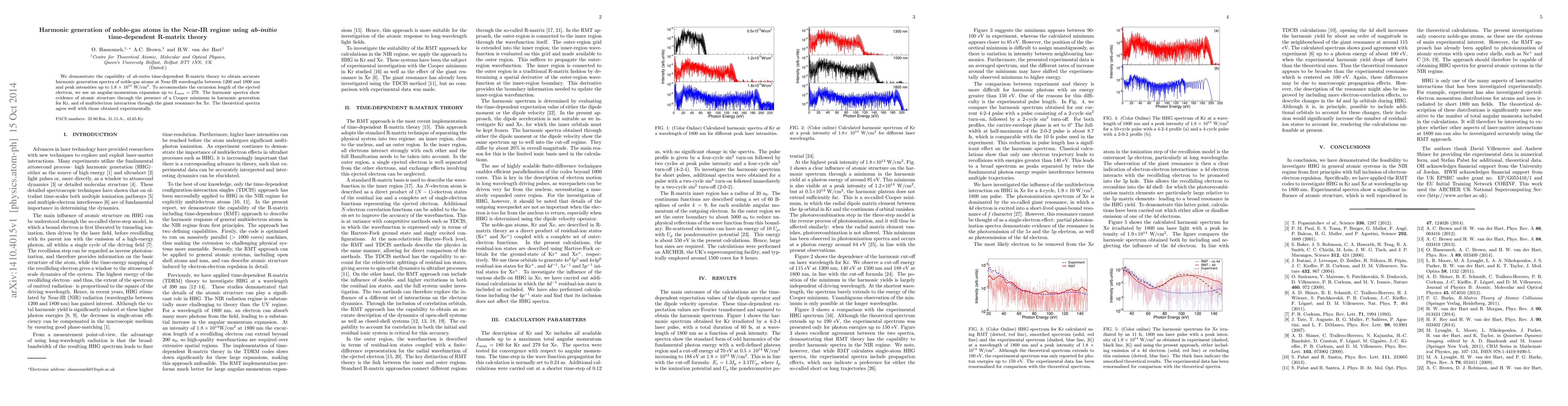 This paper uses ab-initio time-dependent R-matrix theory to accurately model the harmonic generation spectra of noble-gas atoms in the Near-IR regime, showing good agreement with experimental results and revealing atomic structure and multielectron interactions. The method employs an angular-momentum expansion up to Lmax = 279 to account for ejected electron dynamics.