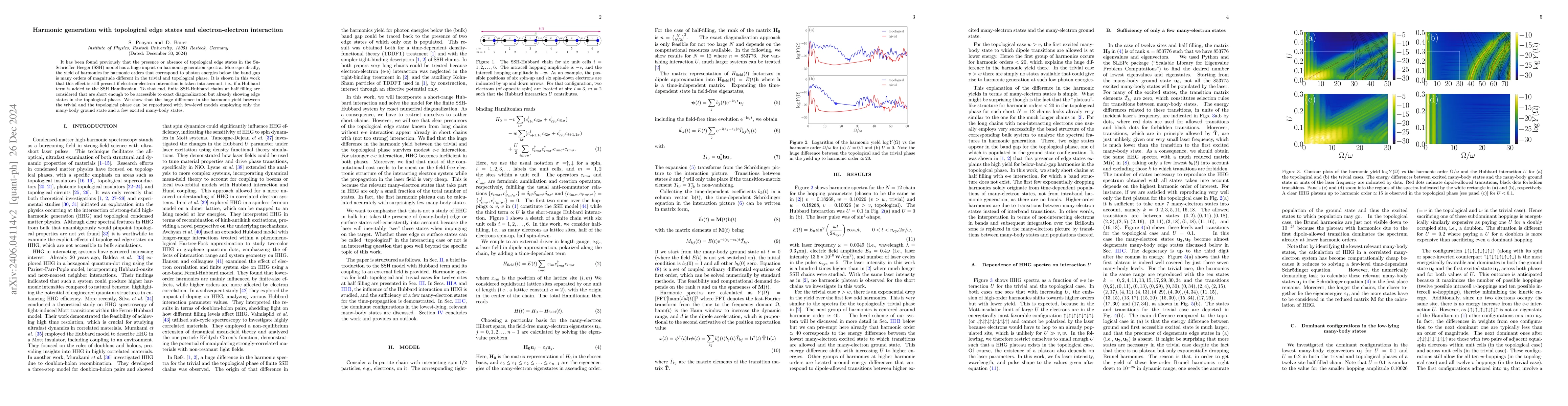 This research demonstrates that the presence of topological edge states in the SSH model significantly affects harmonic generation spectra, even when considering electron-electron interactions via a Hubbard term. The study shows that the harmonic yield differences between the trivial and topological phases persist and can be replicated using simplified few-level models.