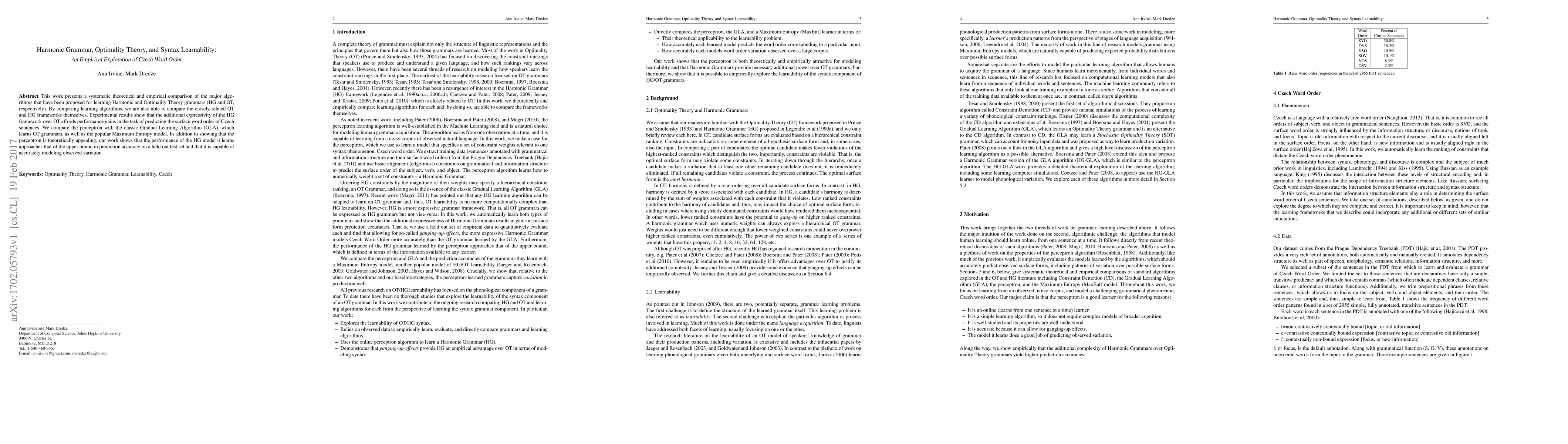 This work presents a systematic theoretical and empirical comparison of the major algorithms that have been proposed for learning Harmonic and Optimality Theory grammars (HG and OT, respectively). By comparing learning algorithms, we are also able to compare the closely related OT and HG frameworks themselves. Experimental results show that the additional expressivity of the HG framework over OT affords performance gains in the task of predicting the surface word order of Czech sentences. We compare the perceptron with the classic Gradual Learning Algorithm (GLA), which learns OT grammars, as well as the popular Maximum Entropy model. In addition to showing that the perceptron is theoretically appealing, our work shows that the performance of the HG model it learns approaches that of the upper bound in prediction accuracy on a held out test set and that it is capable of accurately modeling observed variation.