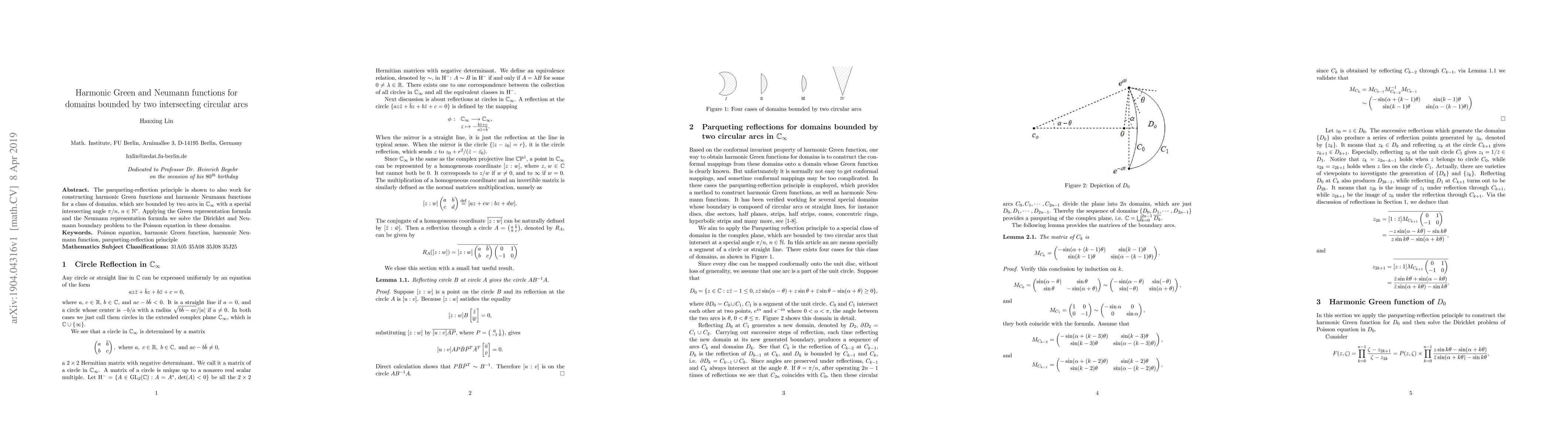 This paper constructs harmonic Green and Neumann functions for domains bounded by two intersecting circular arcs using the parqueting-reflection principle. It applies the Green and Neumann representation formulas to solve the Dirichlet and Neumann boundary problems for the Poisson equation in these domains.