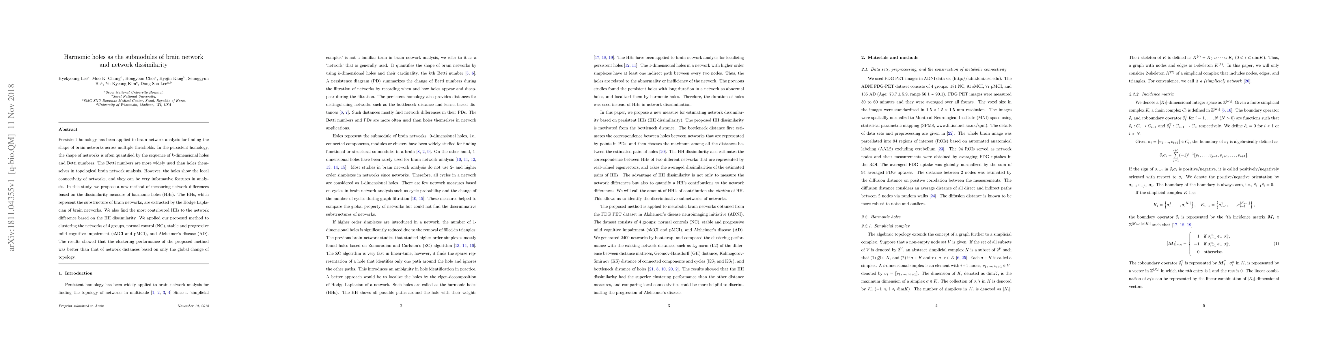 This study proposes a novel method for measuring brain network differences using harmonic holes (HHs), derived from persistent homology, to capture local connectivity. The method outperforms traditional network distance measures based on global topology, as demonstrated by its improved clustering performance across normal controls and various stages of cognitive impairment and Alzheimer's disease.
