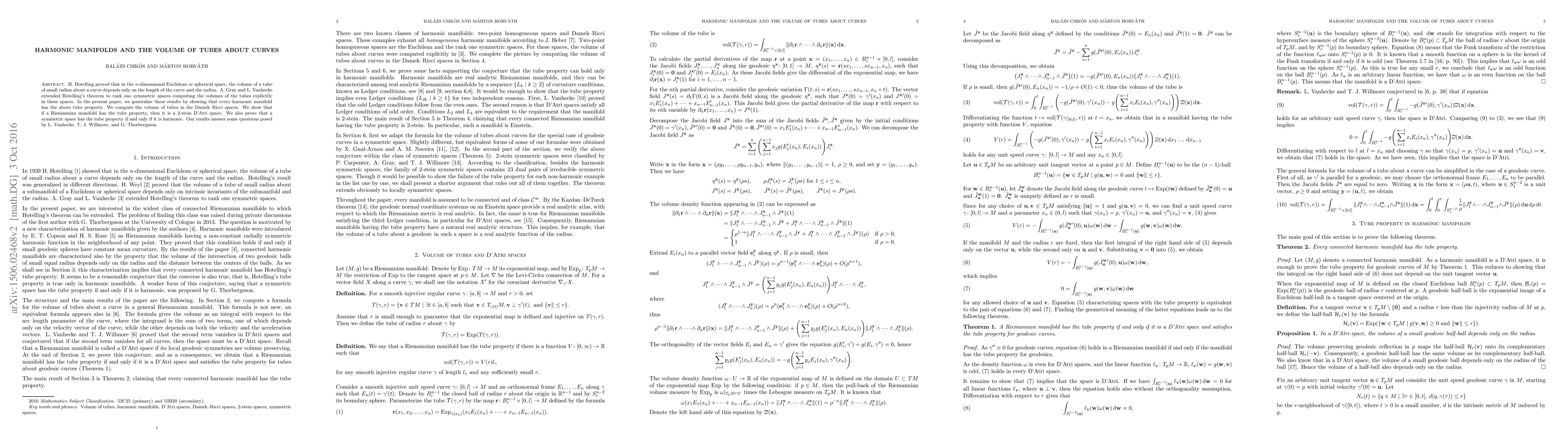 H. Hotelling proved that in the n-dimensional Euclidean or spherical space, the volume of a tube of small radius about a curve depends only on the length of the curve and the radius. A. Gray and L. Vanhecke extended Hotelling's theorem to rank one symmetric spaces computing the volumes of the tubes explicitly in these spaces. In the present paper, we generalize these results by showing that every harmonic manifold has the above tube property. We compute the volume of tubes in the Damek-Ricci spaces. We show that if a Riemannian manifold has the tube property, then it is a 2-stein D'Atri space. We also prove that a symmetric space has the tube property if and only if it is harmonic. Our results answer some questions posed by L. Vanhecke, T. J. Willmore, and G. Thorbergsson.