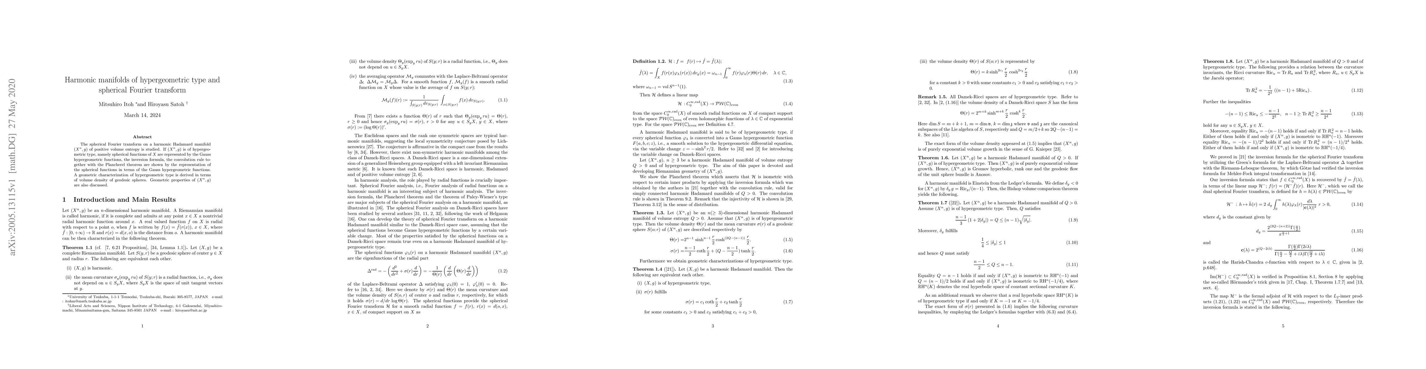 This paper investigates the spherical Fourier transform on harmonic Hadamard manifolds of hypergeometric type, demonstrating inversion, convolution, and Plancherel theorems using Gauss hypergeometric functions. It also provides a geometric characterization based on the volume density of geodesic spheres and discusses related geometric properties.