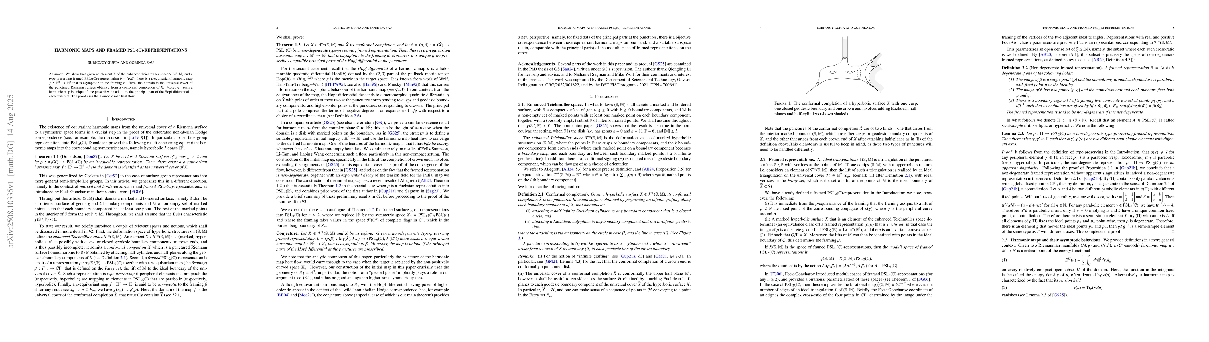 We show that given an element $X$ of the enhanced Teichm\"{u}ller space $\mathcal{T}^\pm(\mathbb{S}, \mathbb{M})$ and a type-preserving framed $\mathrm{PSL}_2(\mathbb{C})$-representation $\hat{\rho} = (\rho,\beta)$, there is a $\rho$-equivariant harmonic map $f:\mathbb{H}^2 \to \mathbb{H}^3$ that is asymptotic to the framing $\beta$. Here, the domain is the universal cover of the punctured Riemann surface obtained from a conformal completion of $X$. Moreover, such a harmonic map is unique if one prescribes, in addition, the principal part of the Hopf differential at each puncture. The proof uses the harmonic map heat flow.