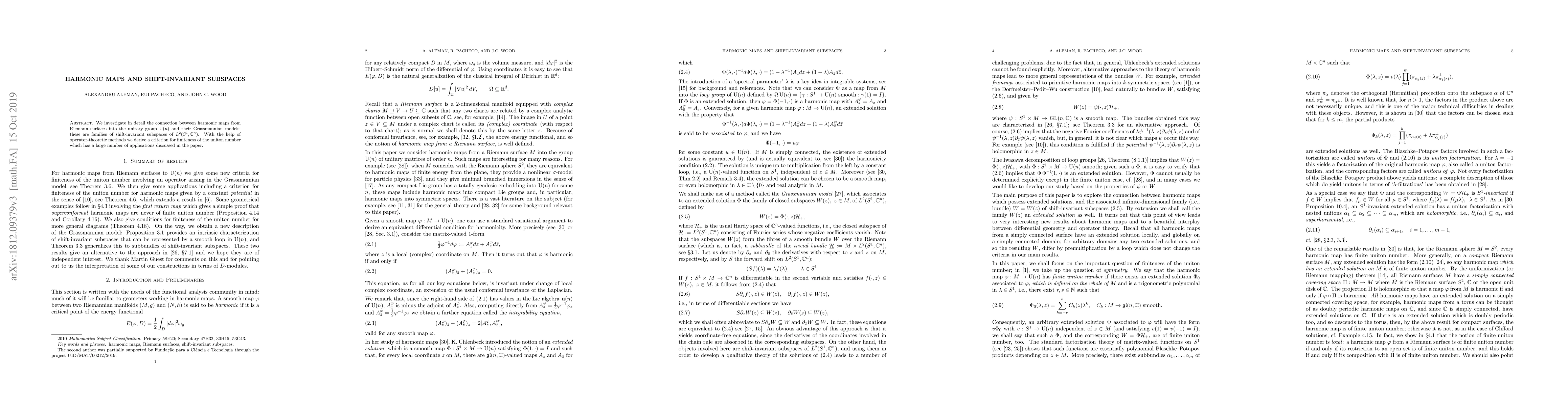 This paper explores the relationship between harmonic maps from Riemann surfaces to the unitary group $\U(n)$ and their Grassmannian models, which are families of shift-invariant subspaces in $L^2(S^1,\C^n)$. It employs operator-theoretic methods to establish a criterion for the finiteness of the uniton number, with numerous applications discussed.