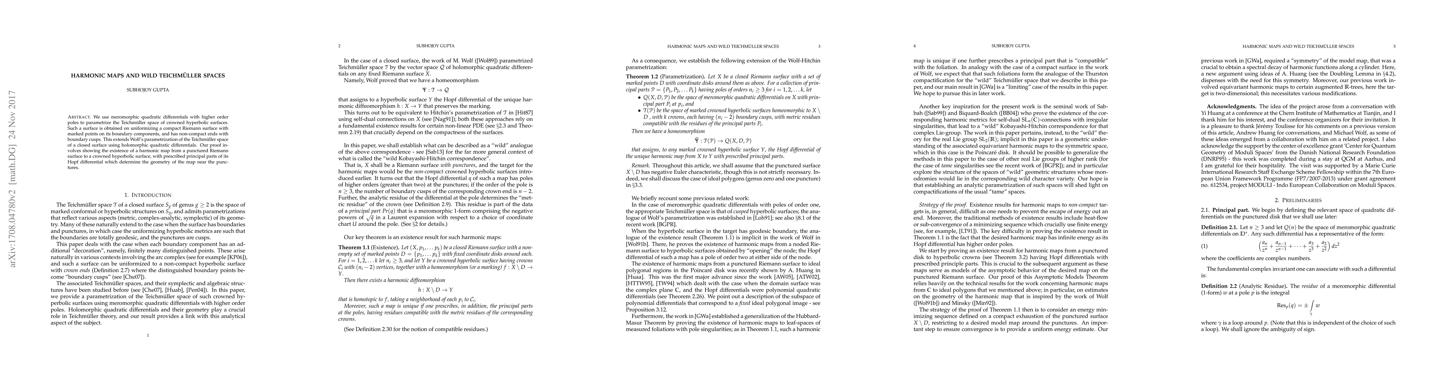 This paper extends Wolf's parametrization of Teichmüller space for closed surfaces to crowned hyperbolic surfaces using meromorphic quadratic differentials with higher-order poles. It proves the existence of harmonic maps from punctured Riemann surfaces to crowned hyperbolic surfaces, prescribing the principal parts of their Hopf differentials to determine the map's geometry near punctures.