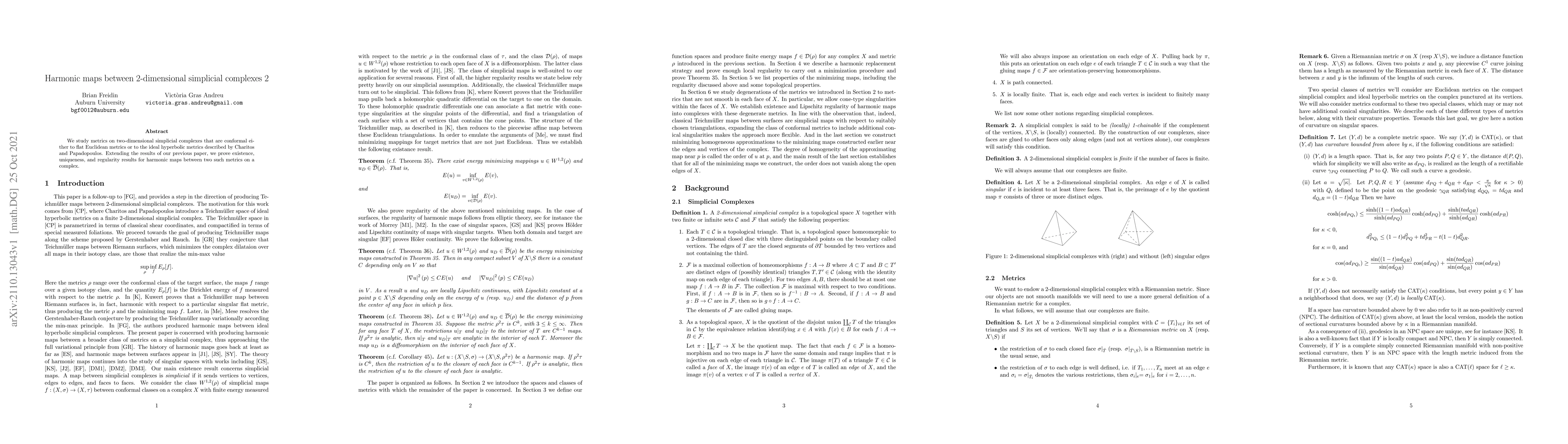 This paper investigates conformal metrics on 2-dimensional simplicial complexes, proving existence, uniqueness, and regularity of harmonic maps between these metrics, extending results from a prior study. The focus is on mappings between flat Euclidean and ideal hyperbolic metrics.
