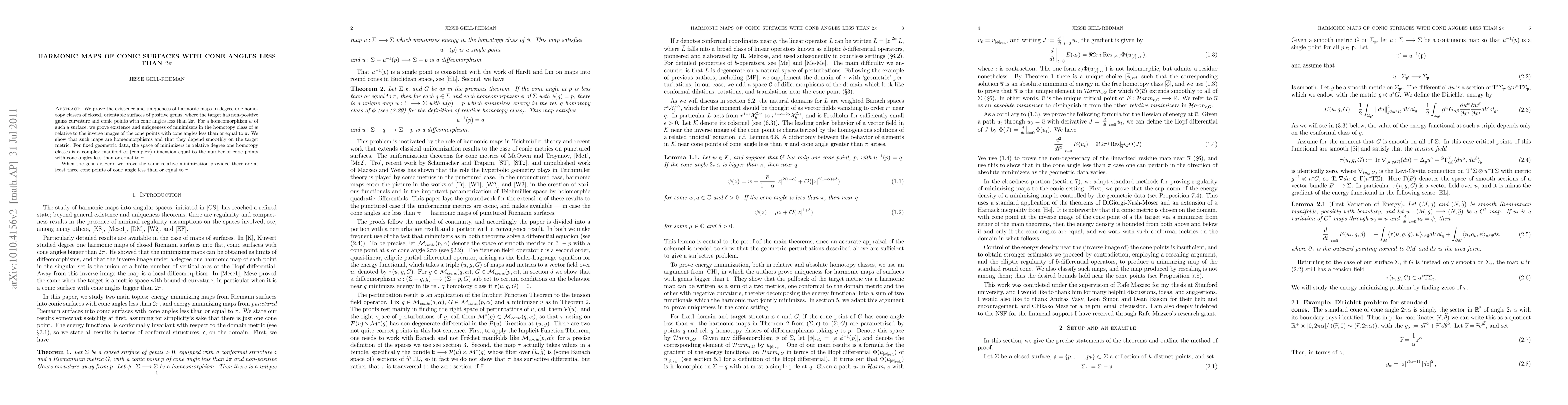 The paper proves the existence and uniqueness of harmonic maps in specific classes of closed surfaces with positive genus to conic surfaces with cone angles less than $2 au$. It also shows that minimizing maps from punctured Riemann surfaces can be uniquely determined by sending a fixed point to a cone point.