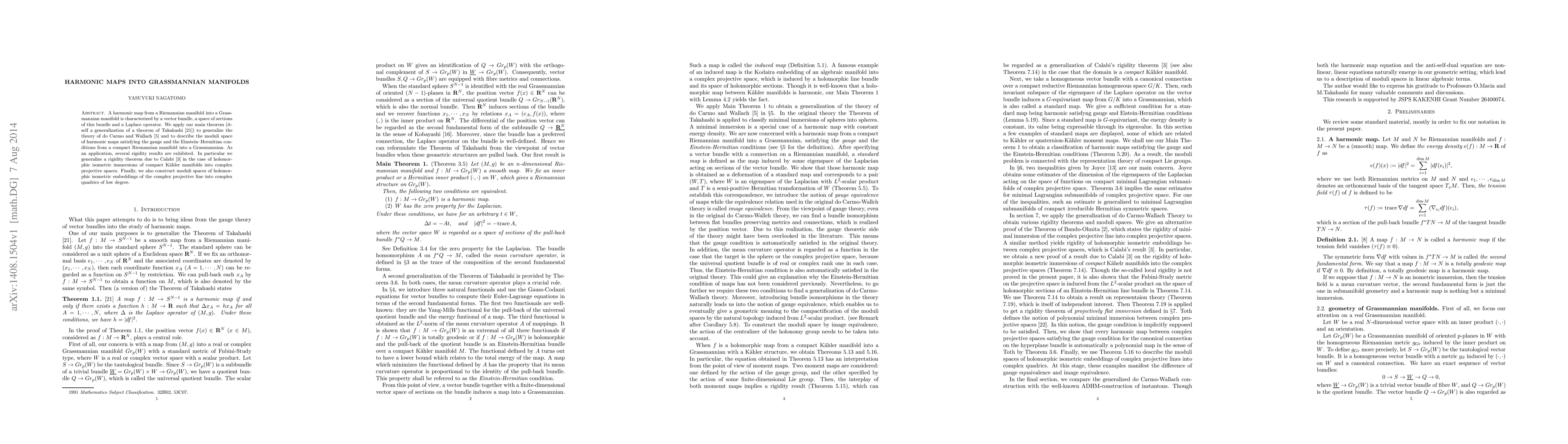 A harmonic map from a Riemannian manifold into a Grassmannian manifold is characterized by a vector bundle, a space of sections of this bundle and a Laplace operator. We apply our main theorem, itself a generalization of a Theorem of Takahashi, to generalize the theory of do Carmo and Wallach and to describe the moduli space of harmonic maps satisfying the gauge and the Einstein-Hermitian conditions from a compact Rieannian manifold into a Grassmannian. As an application, several rigidity results are exihibited. In particular we generalize a rigidity theorem due to Calabi in the case of holomorphic isometric immersions of compact Kaehler manifolds into complex projective spaces. Finally, we also construct moduli spaces of holomorphic isometric embeddings of the complex projective line into complex quadrics of low degree.