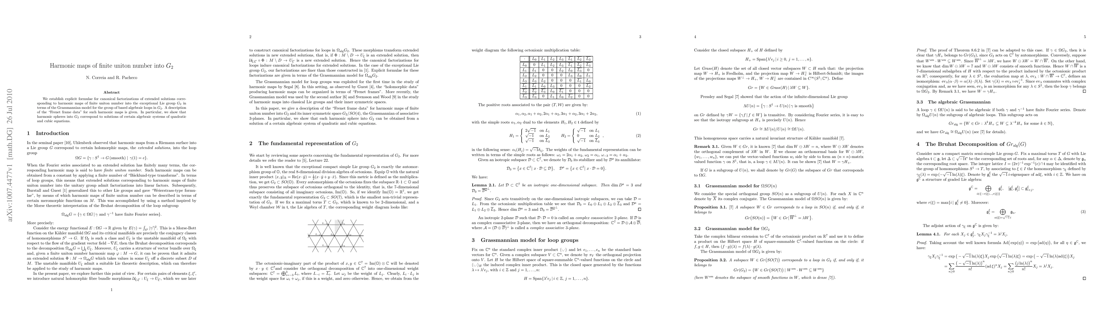 We establish explicit formulae for canonical factorizations of extended solutions corresponding to harmonic maps of finite uniton number into the exceptional Lie group $G_2$ in terms of the Grassmannian model for the group of based algebraic loops in $G_2$. A description of the ``Frenet frame data" for such harmonic maps is given. In particular, we show that harmonic spheres into $G_2$ correspond to solutions of certain algebraic systems of quadratic and cubic equations.