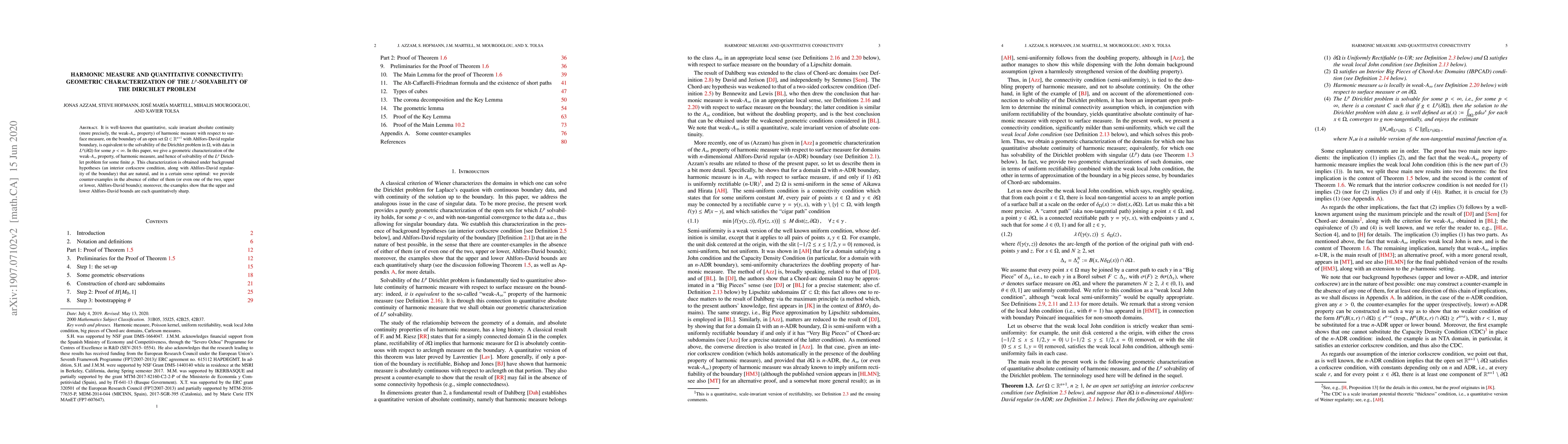 It is well-known that quantitative, scale invariant absolute continuity (more precisely, the weak-$A_\infty$ property) of harmonic measure with respect to surface measure, on the boundary of an open set $ \Omega\subset \mathbb{R}^{n+1}$ with Ahlfors-David regular boundary, is equivalent to the solvability of the Dirichlet problem in $\Omega$, with data in $L^p(\partial\Omega)$ for some $p<\infty$. In this paper, we give a geometric characterization of the weak-$A_\infty$ property, of harmonic measure, and hence of solvability of the $L^p$ Dirichlet problem for some finite $p$. This characterization is obtained under background hypotheses (an interior corkscrew condition, along with Ahlfors-David regularity of the boundary) that are natural, and in a certain sense optimal: we provide counter-examples in the absence of either of them (or even one of the two, upper or lower, Ahlfors-David bounds); moreover, the examples show that the upper and lower Ahlfors-David bounds are each quantitatively sharp.