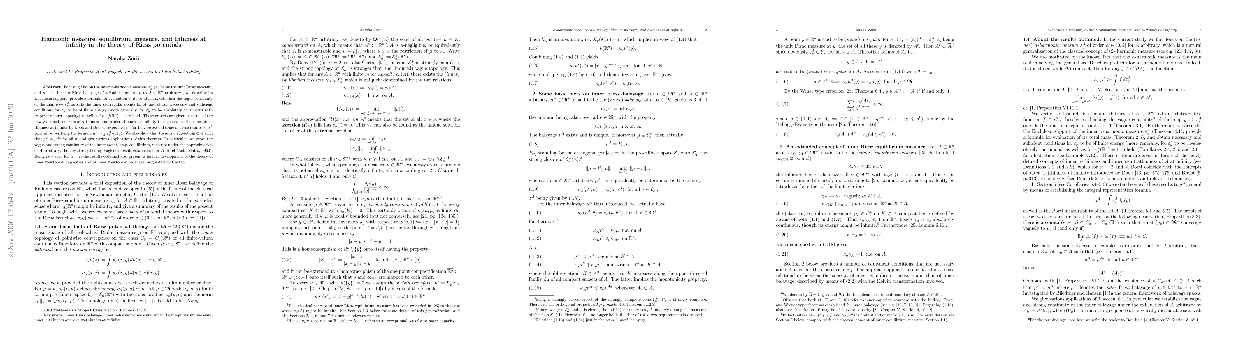 Focusing first on the inner $\alpha$-harmonic measure $\varepsilon_y^A$ ($\varepsilon_y$ being the unit Dirac measure, and $\mu^A$ the inner $\alpha$-Riesz balayage of a Radon measure $\mu$ to $A\subset\mathbb R^n$ arbitrary), we describe its Euclidean support, provide a formula for evaluation of its total mass, establish the vague continuity of the map $y\mapsto\varepsilon_y^A$ outside the inner $\alpha$-irregular points for $A$, and obtain necessary and sufficient conditions for $\varepsilon_y^A$ to be of finite energy (more generally, for $\varepsilon_y^A$ to be absolutely continuous with respect to inner capacity) as well as for $\varepsilon_y^A(\mathbb R^n)\equiv1$ to hold. Those criteria are given in terms of the newly defined concepts of $\alpha$-thinness and $\alpha$-ultrathinness at infinity that generalize the concepts of thinness at infinity by Doob and Brelot, respectively. Further, we extend some of these results to $\mu^A$ general by verifying the formula $\mu^A=\int\varepsilon_y^A\,d\mu(y)$. We also show that there is a $K_\sigma$-set $A_0\subset A$ such that $\mu^A=\mu^{A_0}$ for all $\mu$, and give various applications of this theorem. In particular, we prove the vague and strong continuity of the inner swept, resp. equilibrium, measure under the approximation of $A$ arbitrary, thereby strengthening Fuglede's result established for $A$ Borel (Acta Math., 1960). Being new even for $\alpha=2$, the results obtained also present a further development of the theory of inner Newtonian capacities and of inner Newtonian balayage, originated by Cartan.