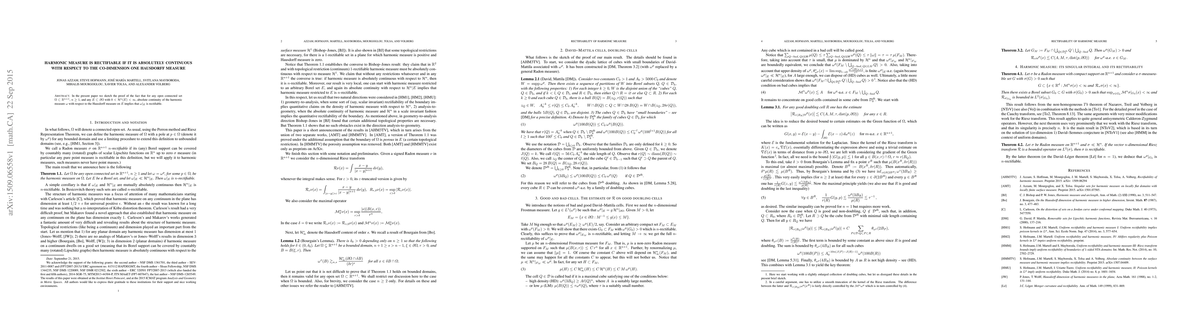 In the present paper we sketch the proof of the fact that for any open connected set $\Omega\subset\mathbb{R}^{n+1}$, $n\geq 1$, and any $E\subset \partial \Omega$ with $0<\mathcal{H}^n(E)<\infty$, absolute continuity of the harmonic measure $\omega$ with respect to the Hausdorff measure on $E$ implies that $\omega|_E$ is rectifiable.