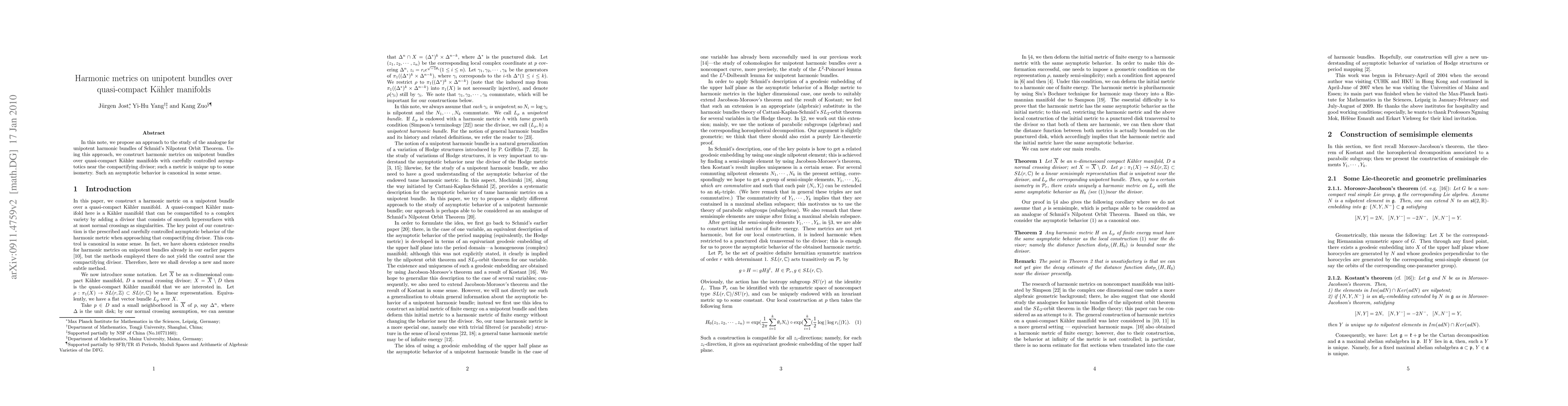 Summary: This paper proposes an approach to study unipotent harmonic bundles, constructs harmonic metrics on these bundles over quasi-compact Kähler manifolds with controlled asymptotics near divisors, and demonstrates the uniqueness of such metrics up to isometry.