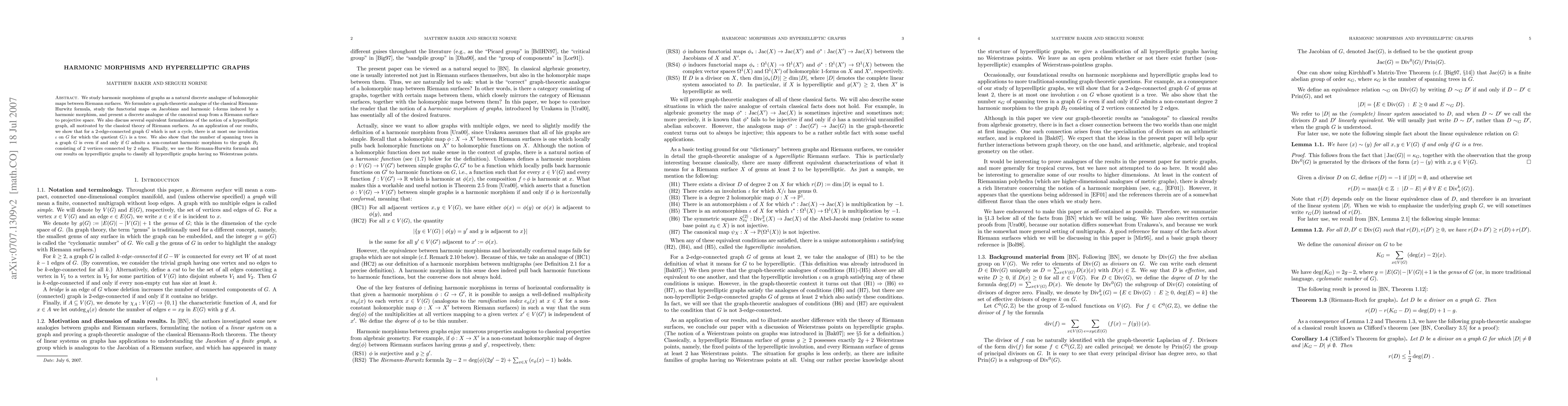 We study harmonic morphisms of graphs as a natural discrete analogue of holomorphic maps between Riemann surfaces. We formulate a graph-theoretic analogue of the classical Riemann-Hurwitz formula, study the functorial maps on Jacobians and harmonic 1-forms induced by a harmonic morphism, and present a discrete analogue of the canonical map from a Riemann surface to projective space. We also discuss several equivalent formulations of the notion of a hyperelliptic graph, all motivated by the classical theory of Riemann surfaces. As an application of our results, we show that for a 2-edge-connected graph G which is not a cycle, there is at most one involution $\iota$ on G for which the quotient $G/\iota$ is a tree. We also show that the number of spanning trees in a graph G is even if and only if G admits a non-constant harmonic morphism to the graph B_2 consisting of 2 vertices connected by 2 edges. Finally, we use the Riemann-Hurwitz formula and our results on hyperelliptic graphs to classify all hyperelliptic graphs having no Weierstrass points.