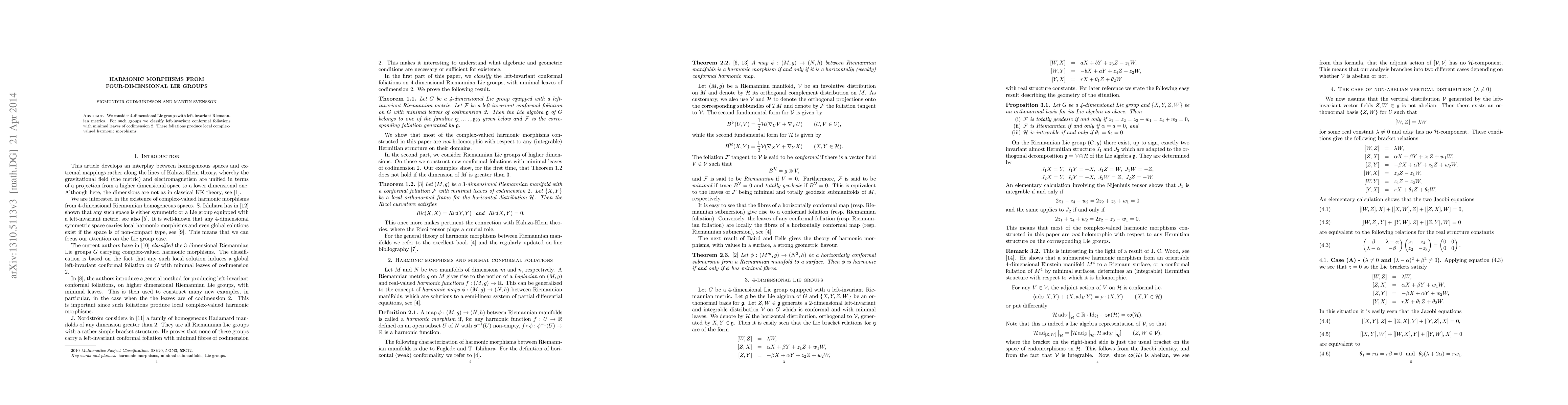 Summary: This paper classifies left-invariant conformal foliations with minimal leaves of codimension two in four dimensional Lie groups, leading to the identification of local complex-valued harmonic morphisms. The study focuses on groups equipped with left-invariant Riemannian metrics.