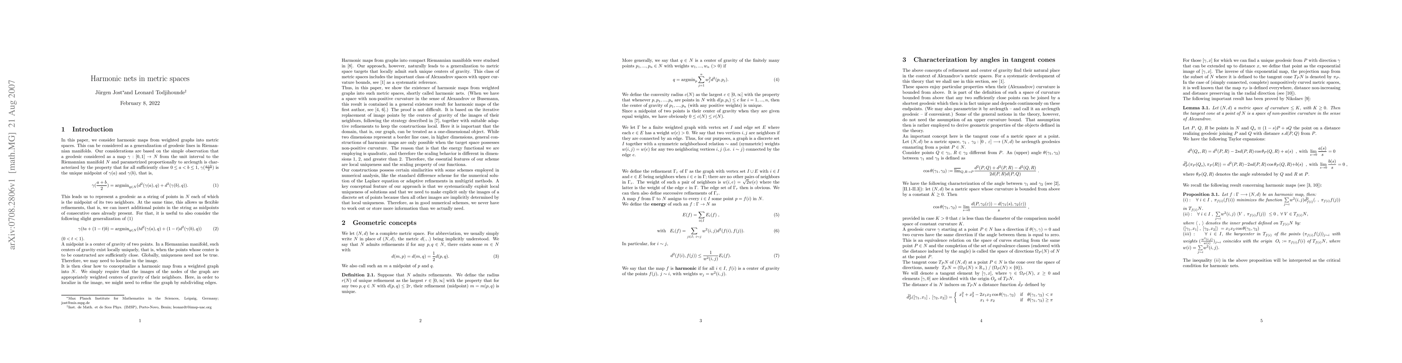 We investigate harmonic maps from weighted graphs into metric spaces that locally admit unique centers of gravity, like Alexandrov spaces with upper curvature bounds. We prove an existence result by constructing an iterative geometric process that converges to such maps, called harmonic nets for short.