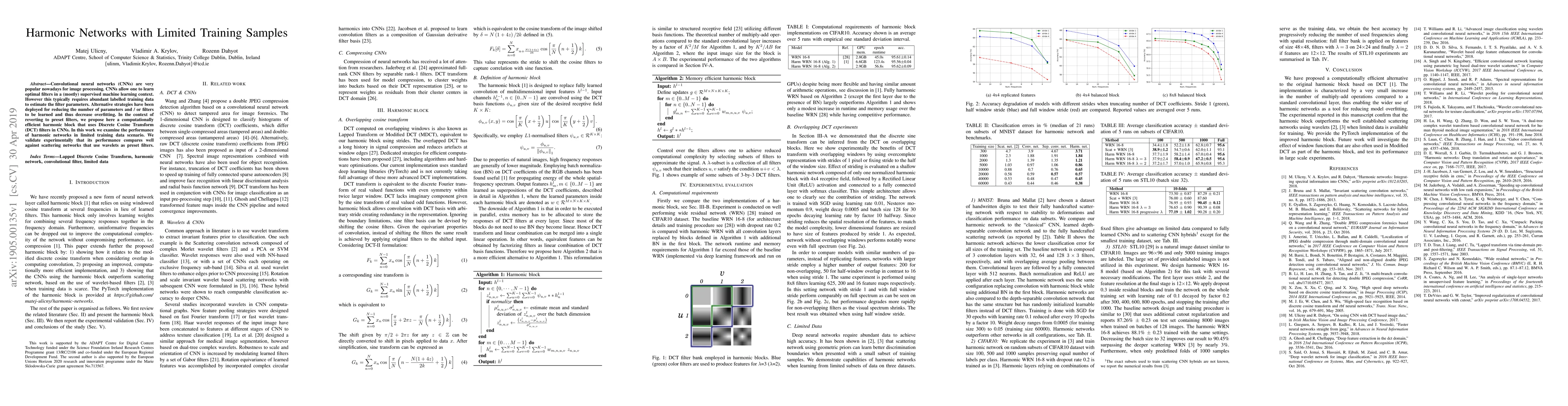 Convolutional neural networks (CNNs) are very popular nowadays for image processing. CNNs allow one to learn optimal filters in a (mostly) supervised machine learning context. However this typically requires abundant labelled training data to estimate the filter parameters. Alternative strategies have been deployed for reducing the number of parameters and / or filters to be learned and thus decrease overfitting. In the context of reverting to preset filters, we propose here a computationally efficient harmonic block that uses Discrete Cosine Transform (DCT) filters in CNNs. In this work we examine the performance of harmonic networks in limited training data scenario. We validate experimentally that its performance compares well against scattering networks that use wavelets as preset filters.