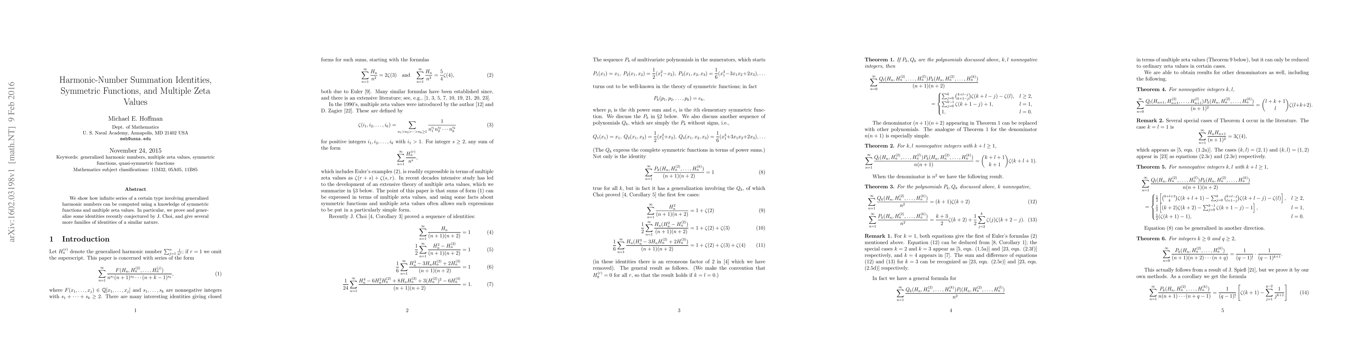 This paper demonstrates the computation of infinite series involving generalized harmonic numbers through the use of symmetric functions and multiple zeta values. It proves and generalizes conjectured identities by J. Choi and introduces additional families of similar identities.